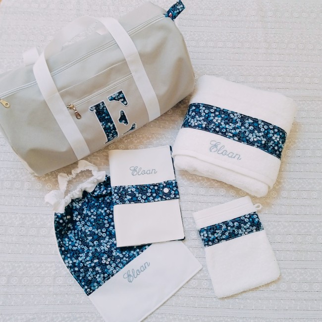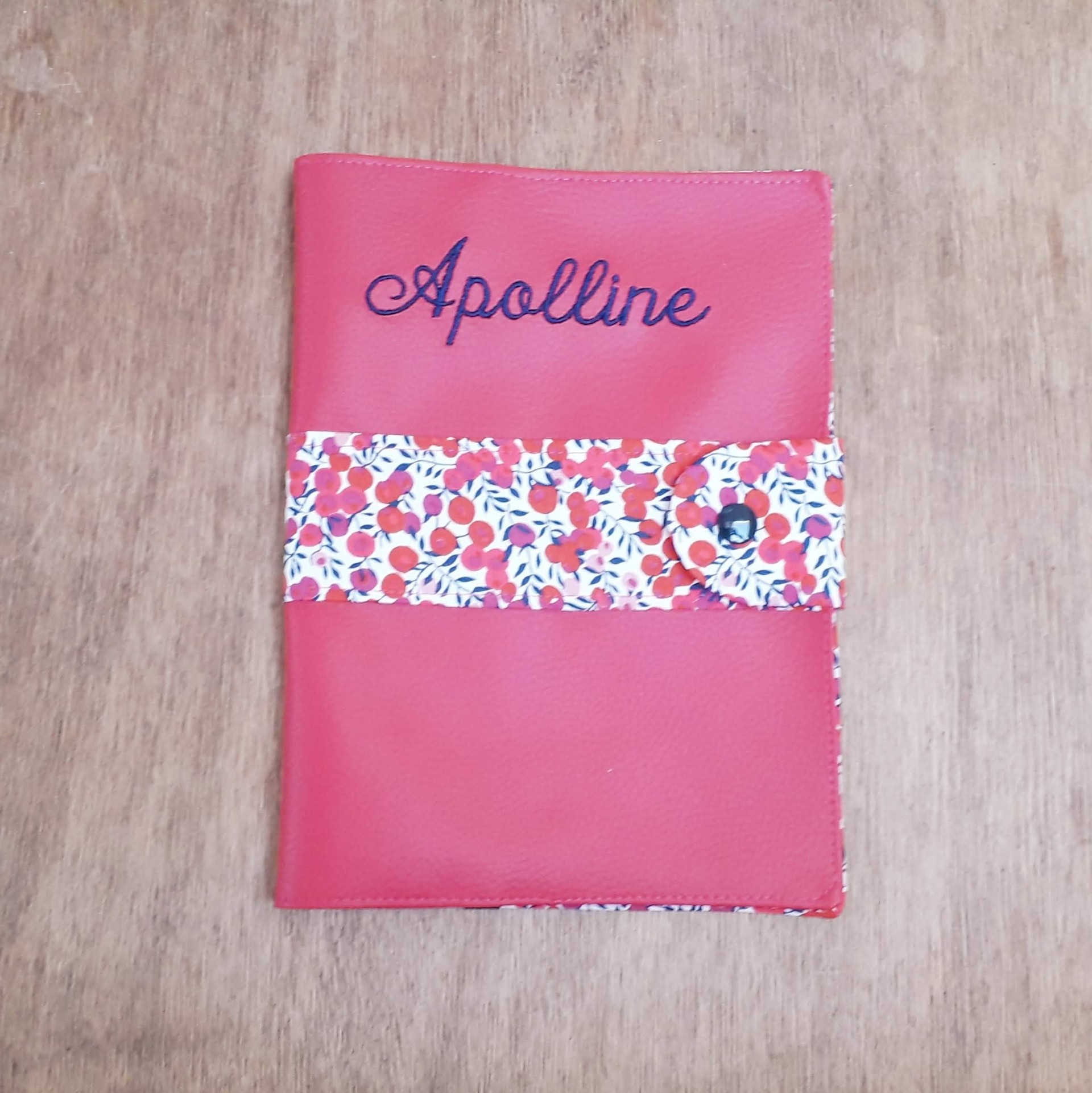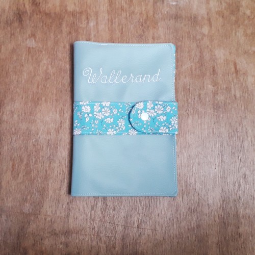 bi matière: couverture en simili, brodée, et bandeau d'attache en Liberty avec une pression.