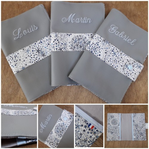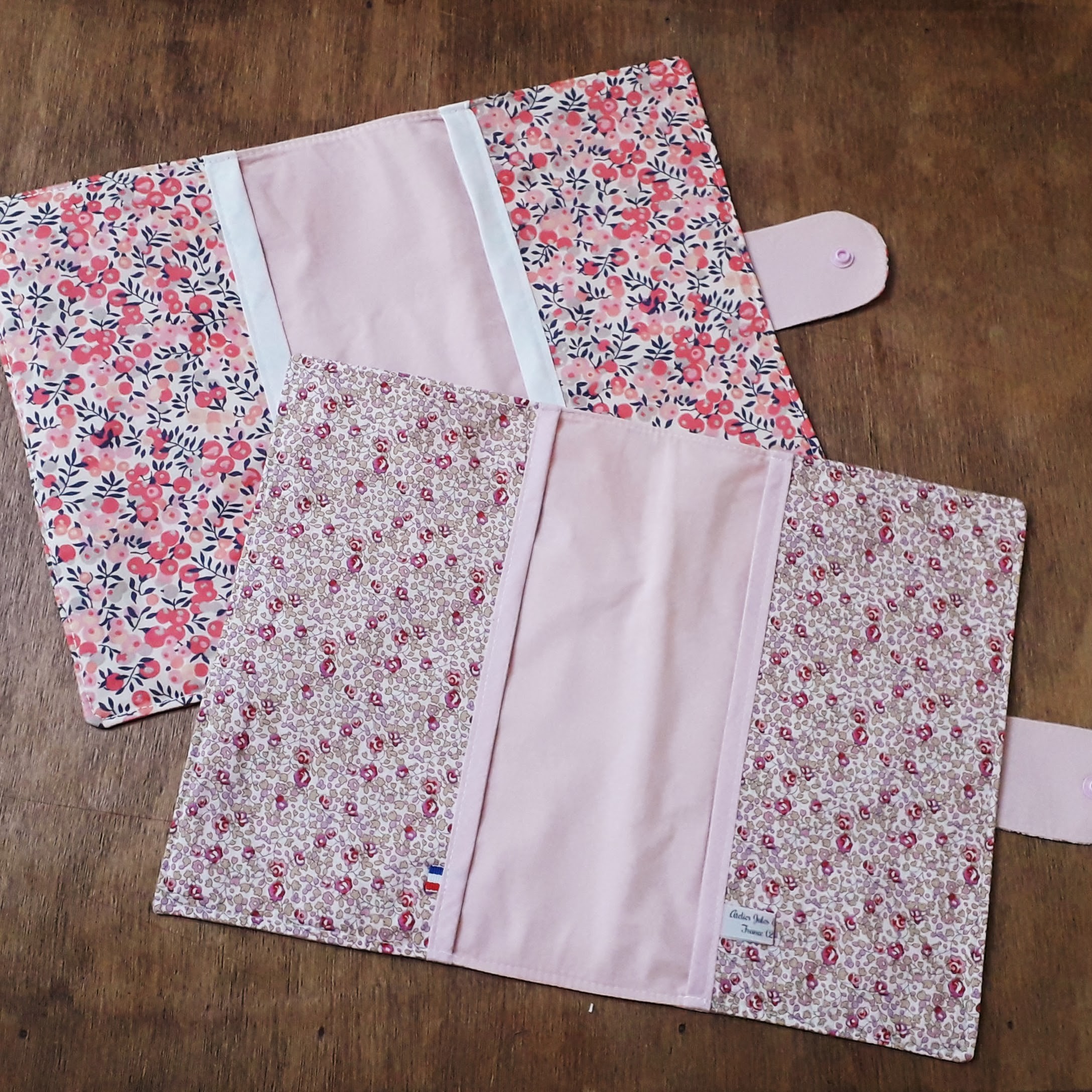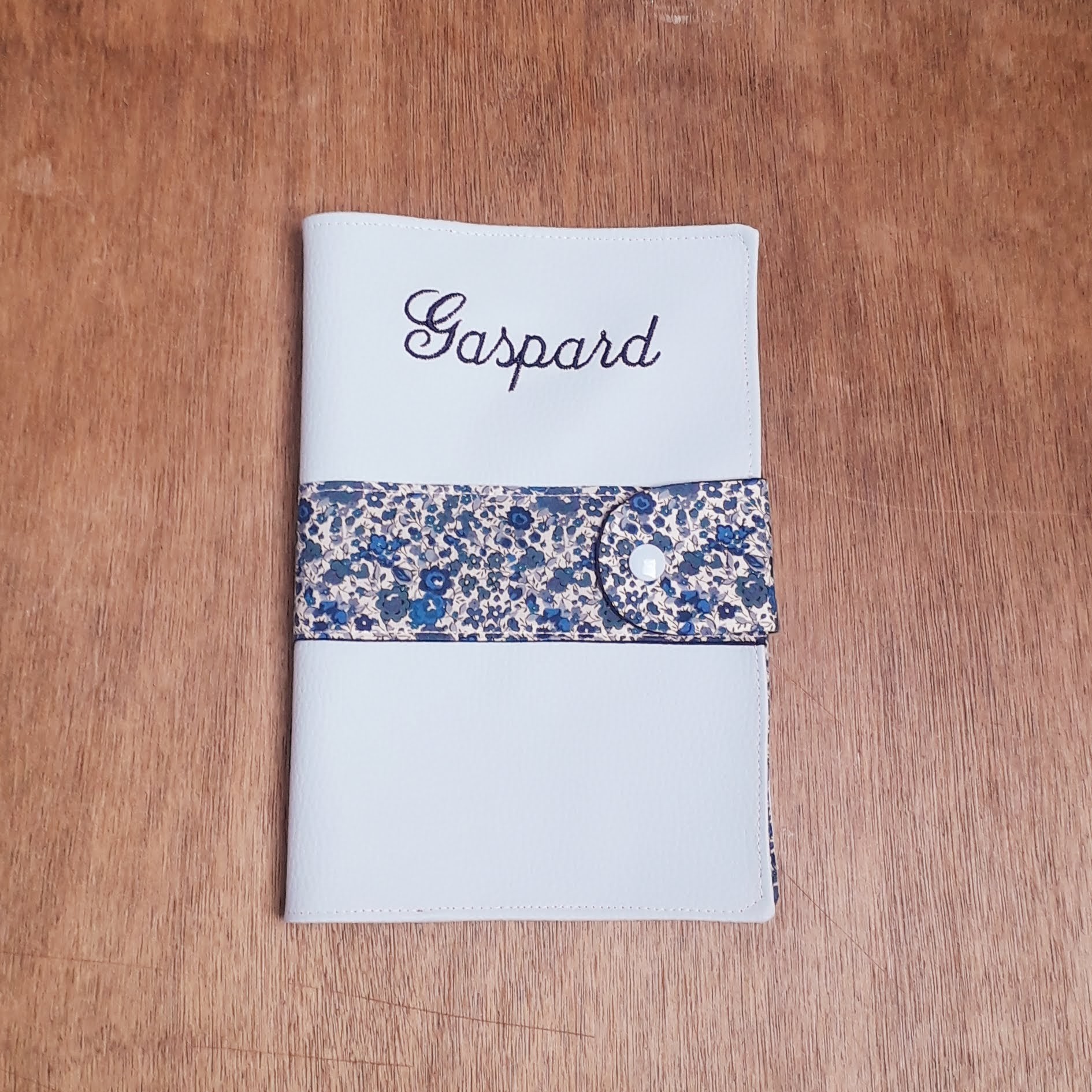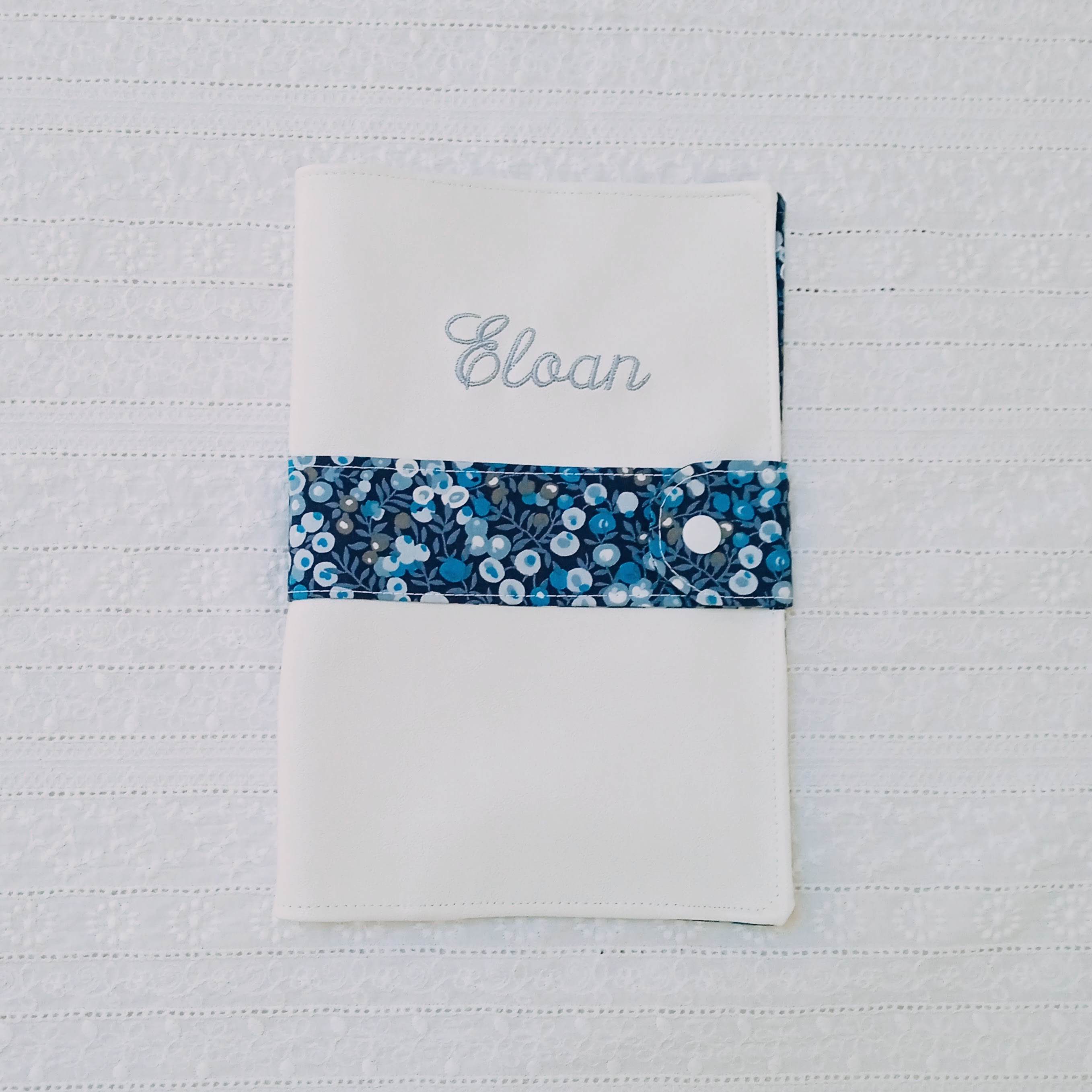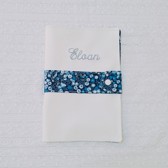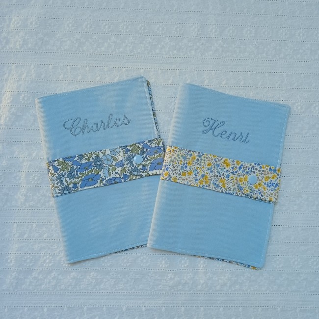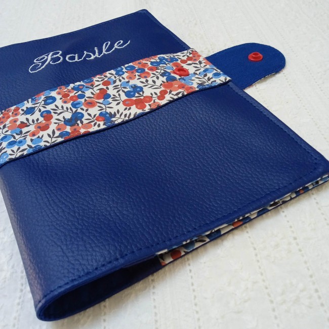 le protège carnet de santé, existe également en version "inversée": la couverture en Liberty et le bandeau d'attache en simili, brodé.