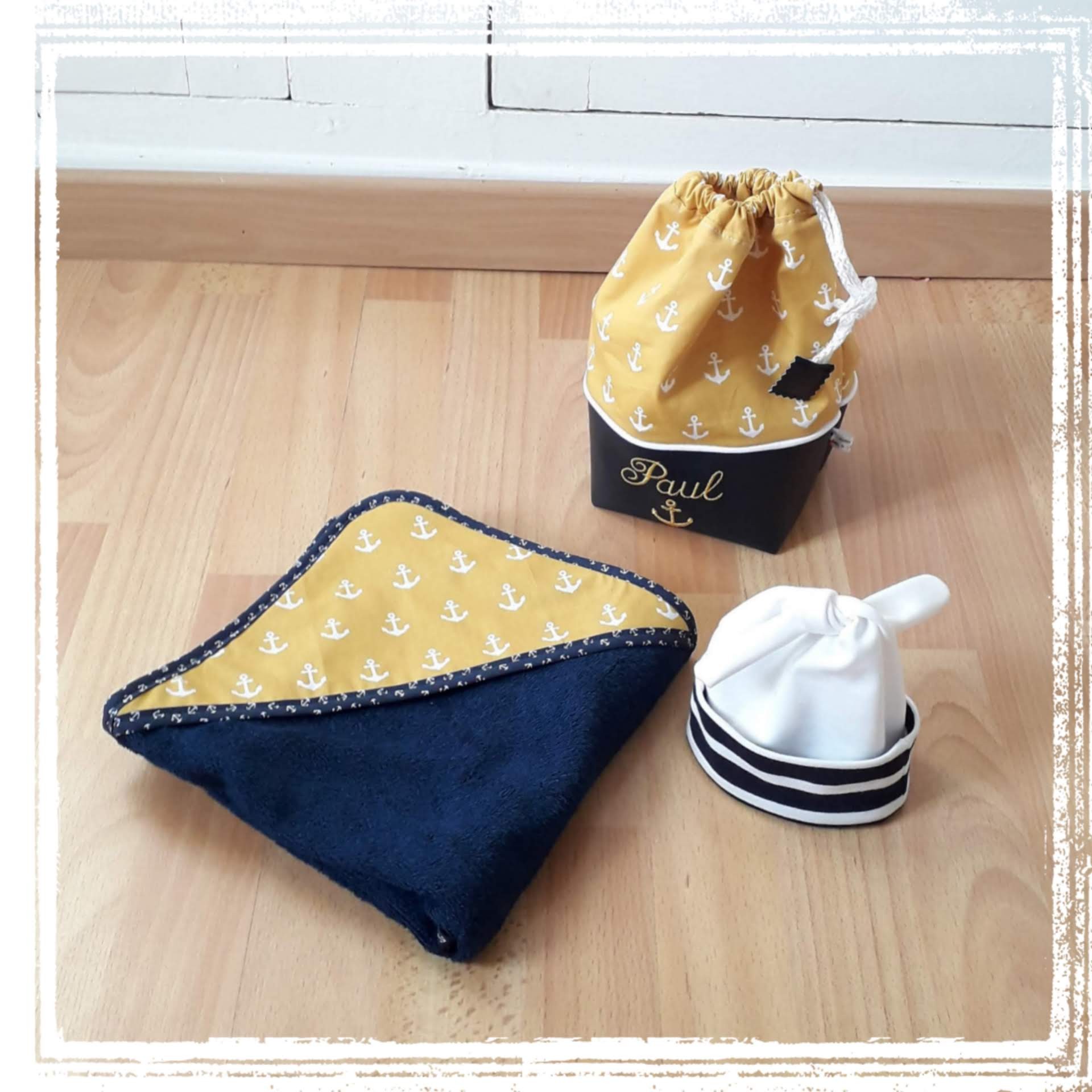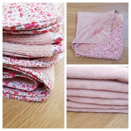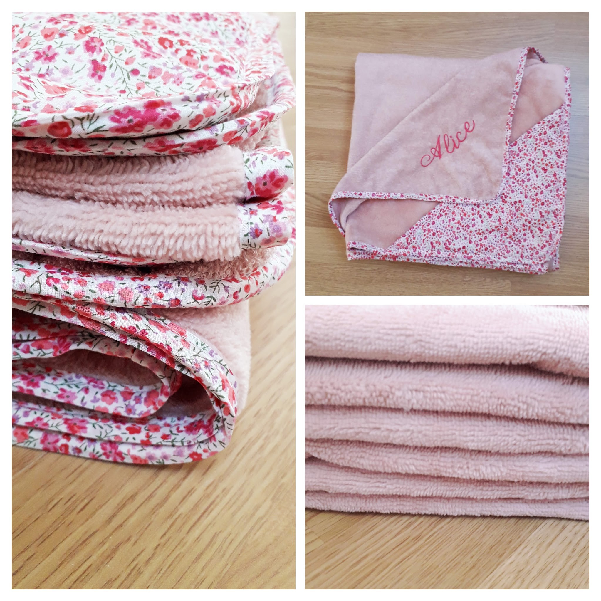 - une cape de bain en popeline de coton, 70cmx70cm, capuche en tissu coton (Liberty ou autre motif), cape en micro éponge de bambou.