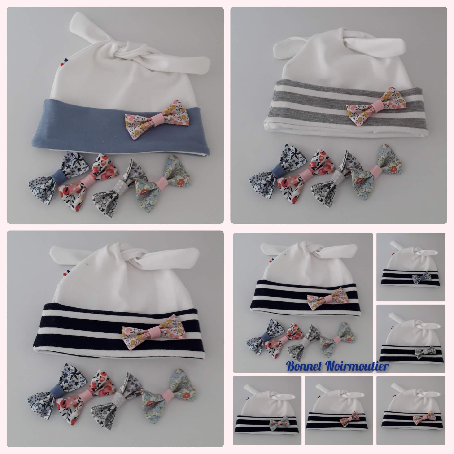 - un bonnet noué en jersey, avec un rabat assorti. La version fille comporte un petit ruban assorti cousu sur le rabat. taille à préciser: 3/6 mois, 9/12 mois