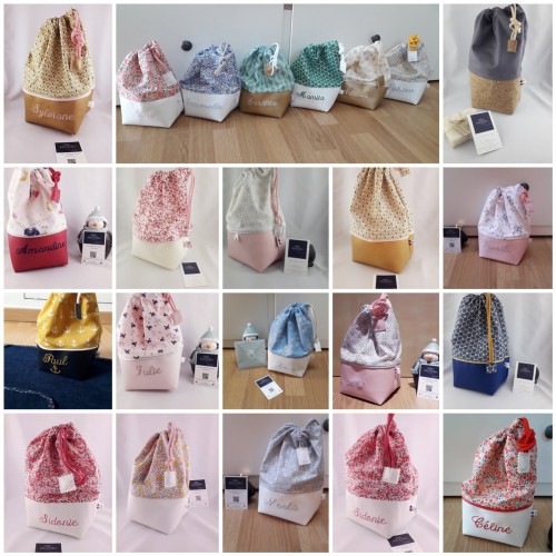 - un Panier baluchon "Jules" en simili et tissu coton (Liberty ou autre motif) , doublure coton uni, brodé au prénom de l'enfant (à préciser!)