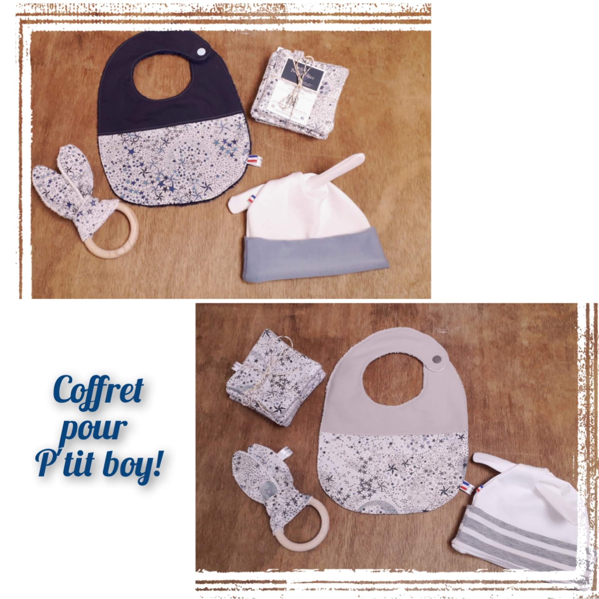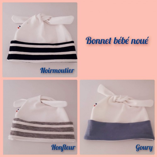 - 1 bonnet noué blanc, 3 versions possibles, à préciser lors de la commande: rabat Noirmoutier (rayé marine & blanc), Honfleur (rayé gris & blanc), ou Goury (bleu jean)