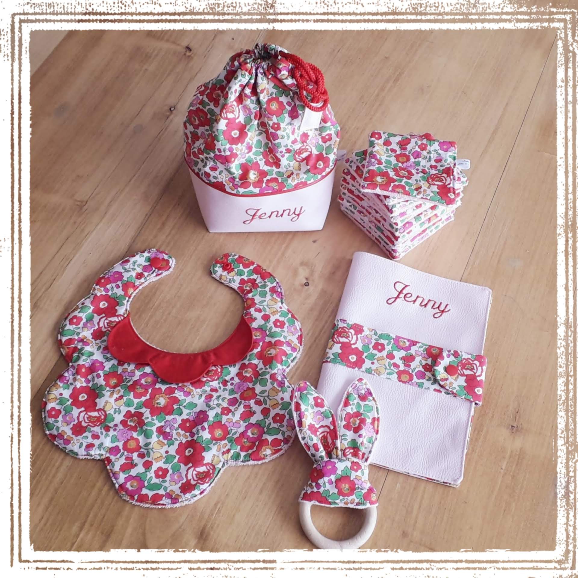 - un Panier baluchon "Jules" en simili et tissu coton Liberty , doublure coton uni, brodé au prénom de l'enfant, garni de 10 lingettes lavables assorties.