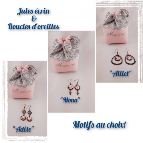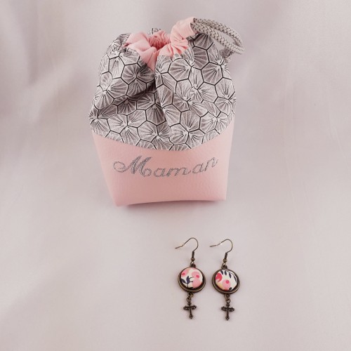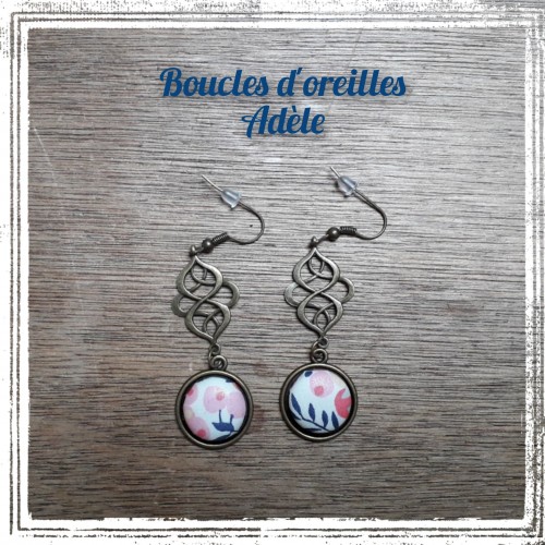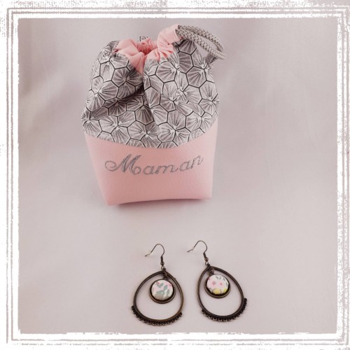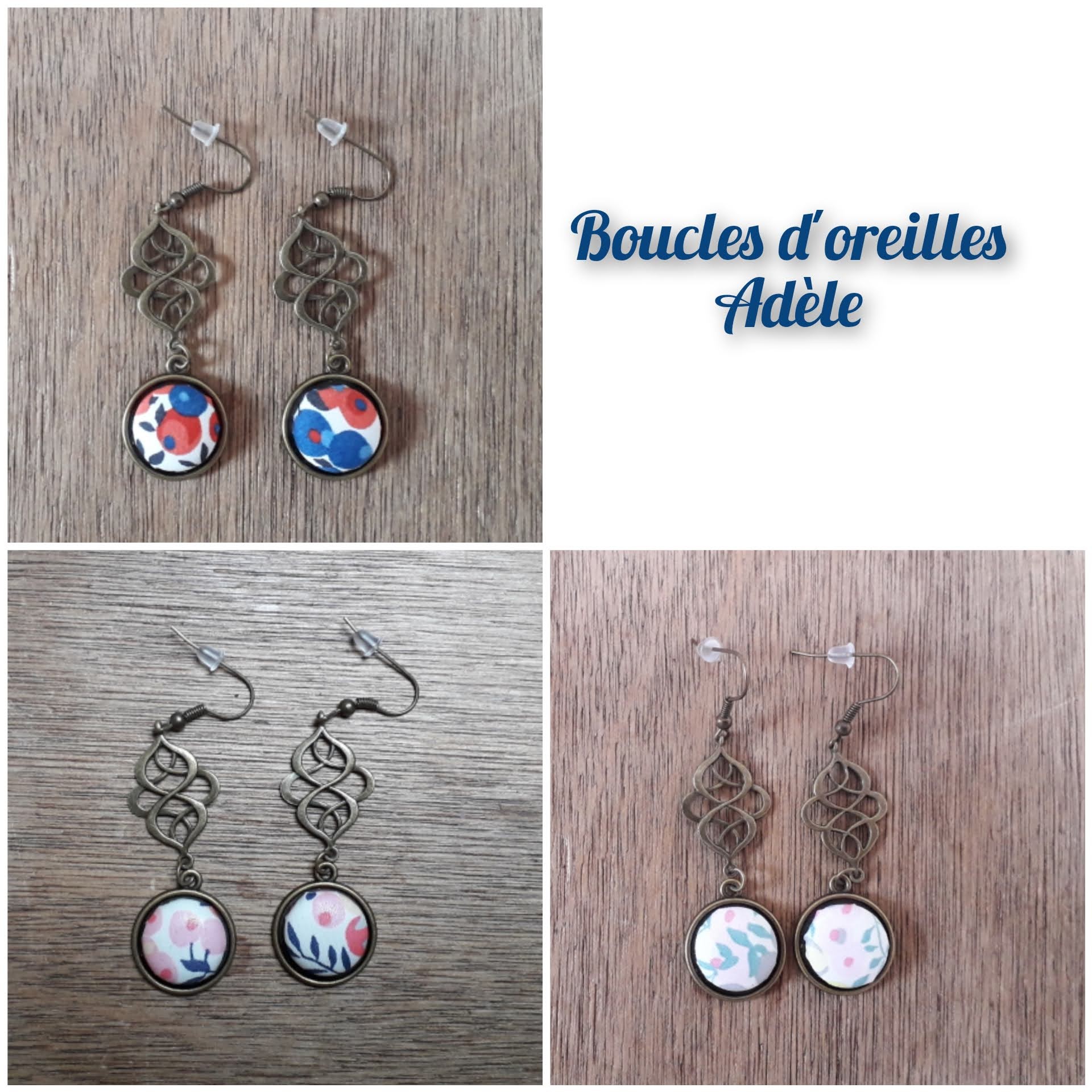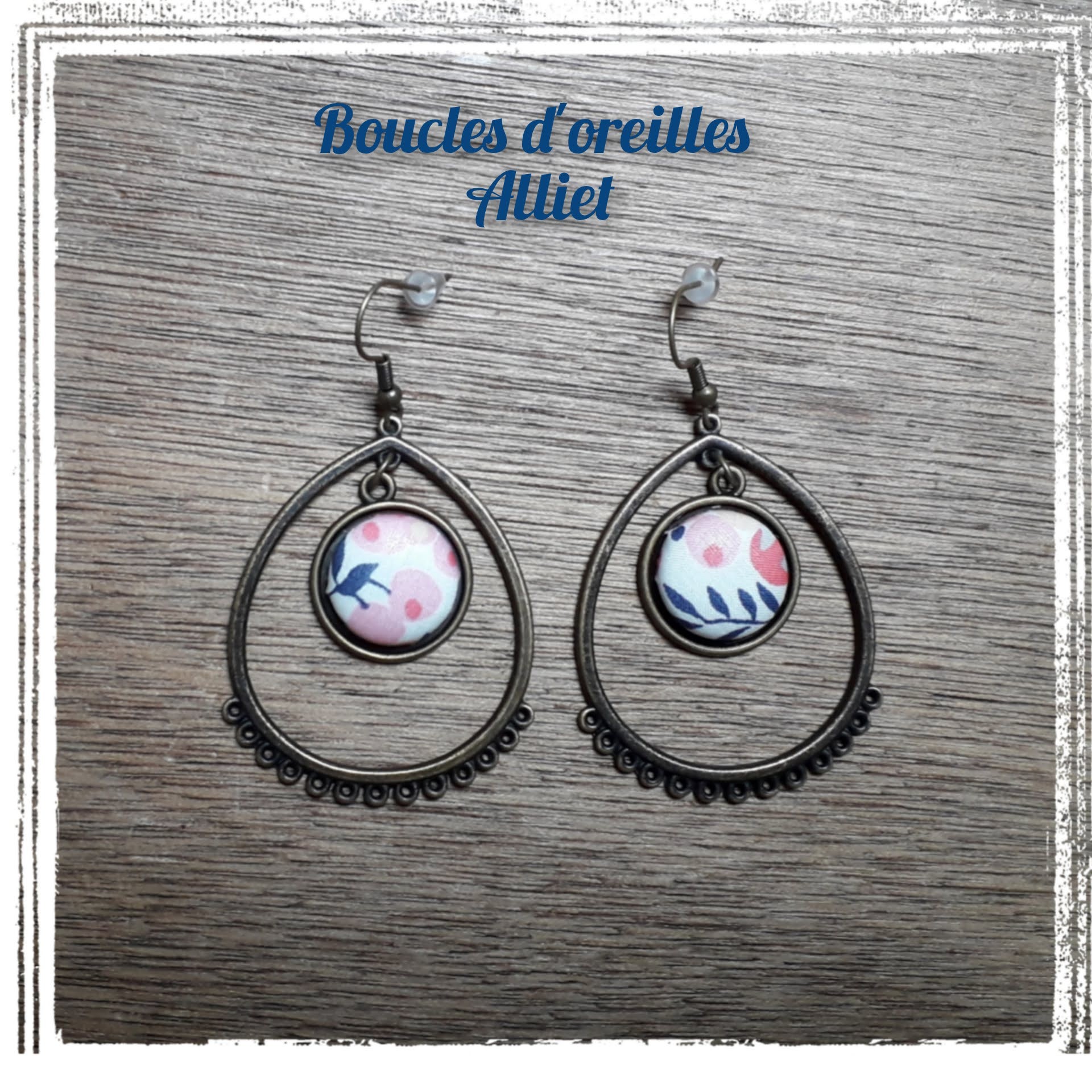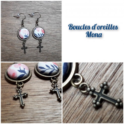 - Une paire de boucles d'oreilles, couleur bronze antique (garantie sans nickel ni plomb). BO pendantes pour oreilles percées, env. 5,5cm de longueur. Bouton recouvert d'un tissu de votre choix.