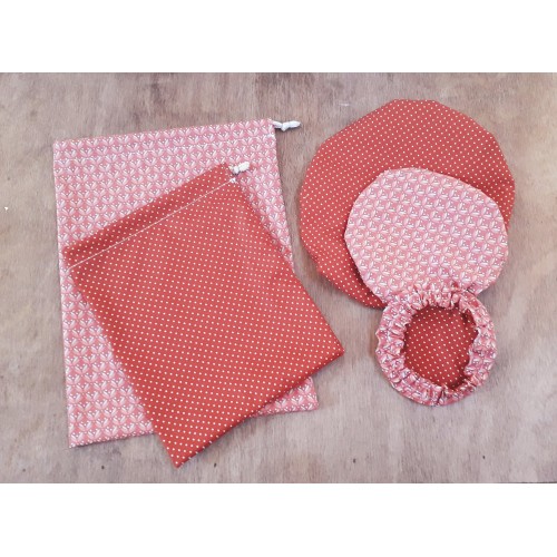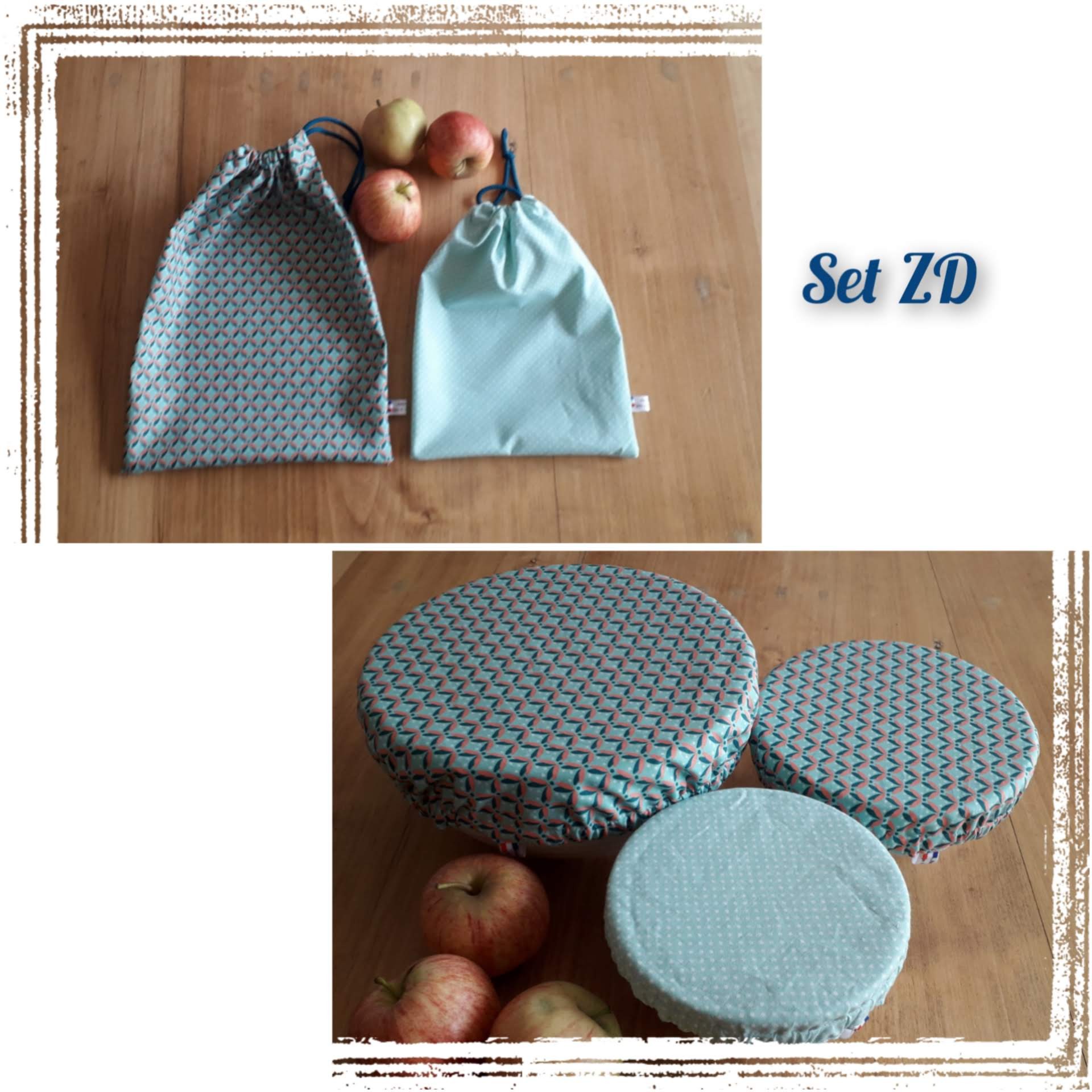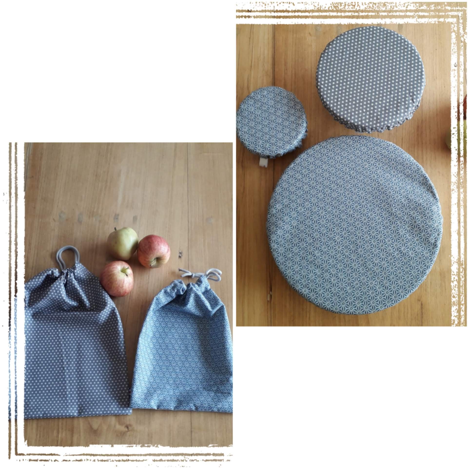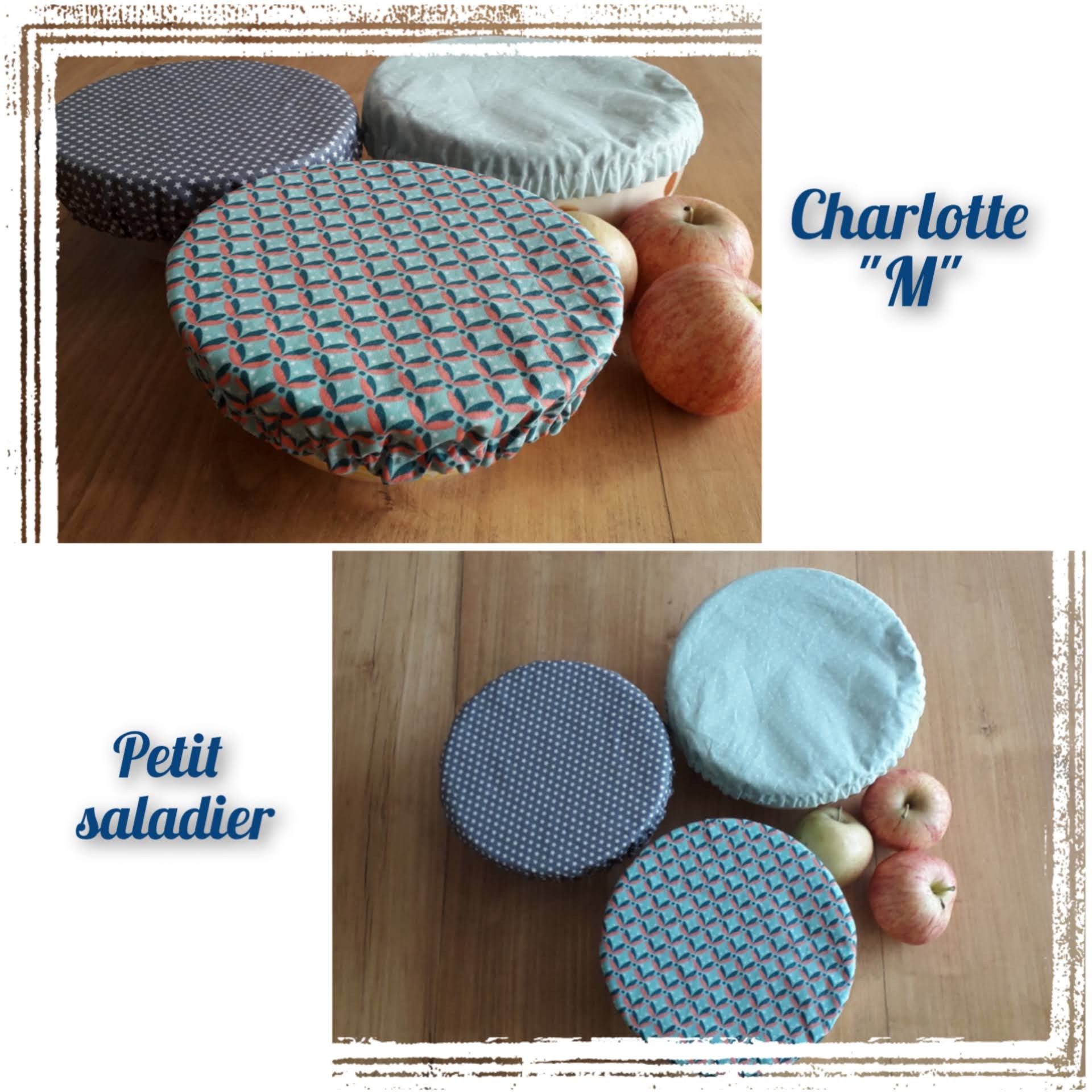 -3 charlottes à saladier taille M, L, S (du bol au grand saladier!) Double face, une face en coton enduit (étanche et imperméable), idéale pour recouvrir des plats contenants des aliments "humides" (salades composées, légumes cuisinés, plats en sauces...), et une face en coton, adaptée pour les aliments "secs", tels que des bonbons, fruits entiers, légumes, chips...