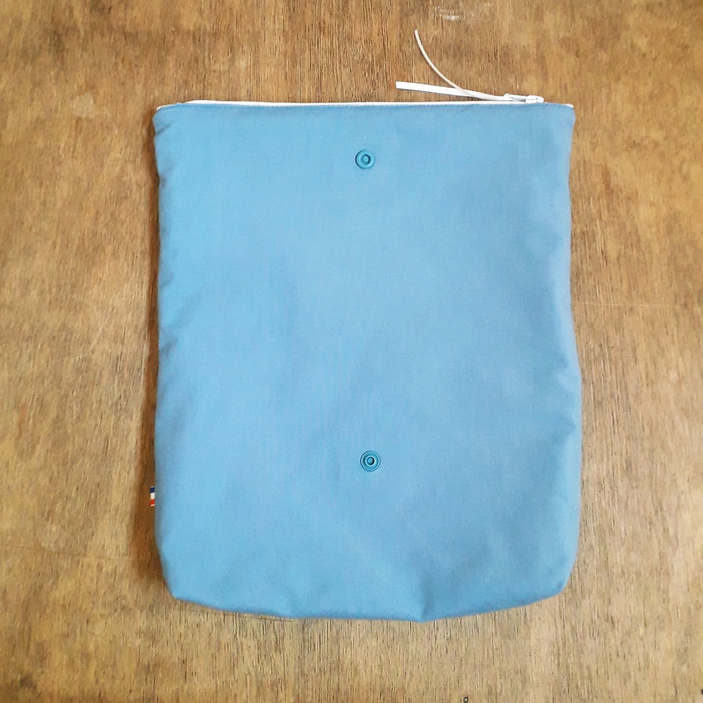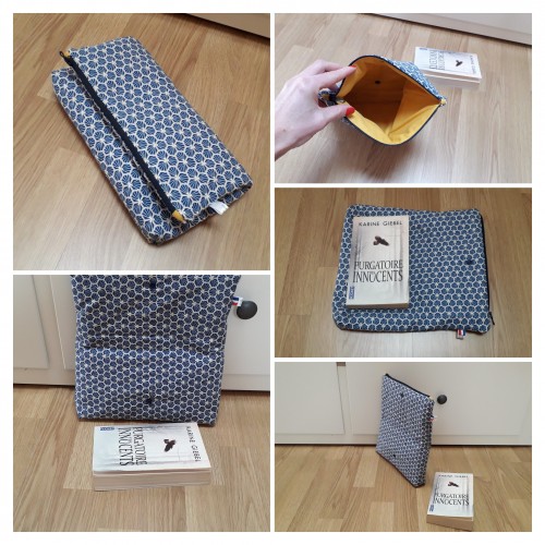 Ajustable à la taille du livre : Fermeture par un zip,puis peut se rabattre et se fermer grâce à une pression.