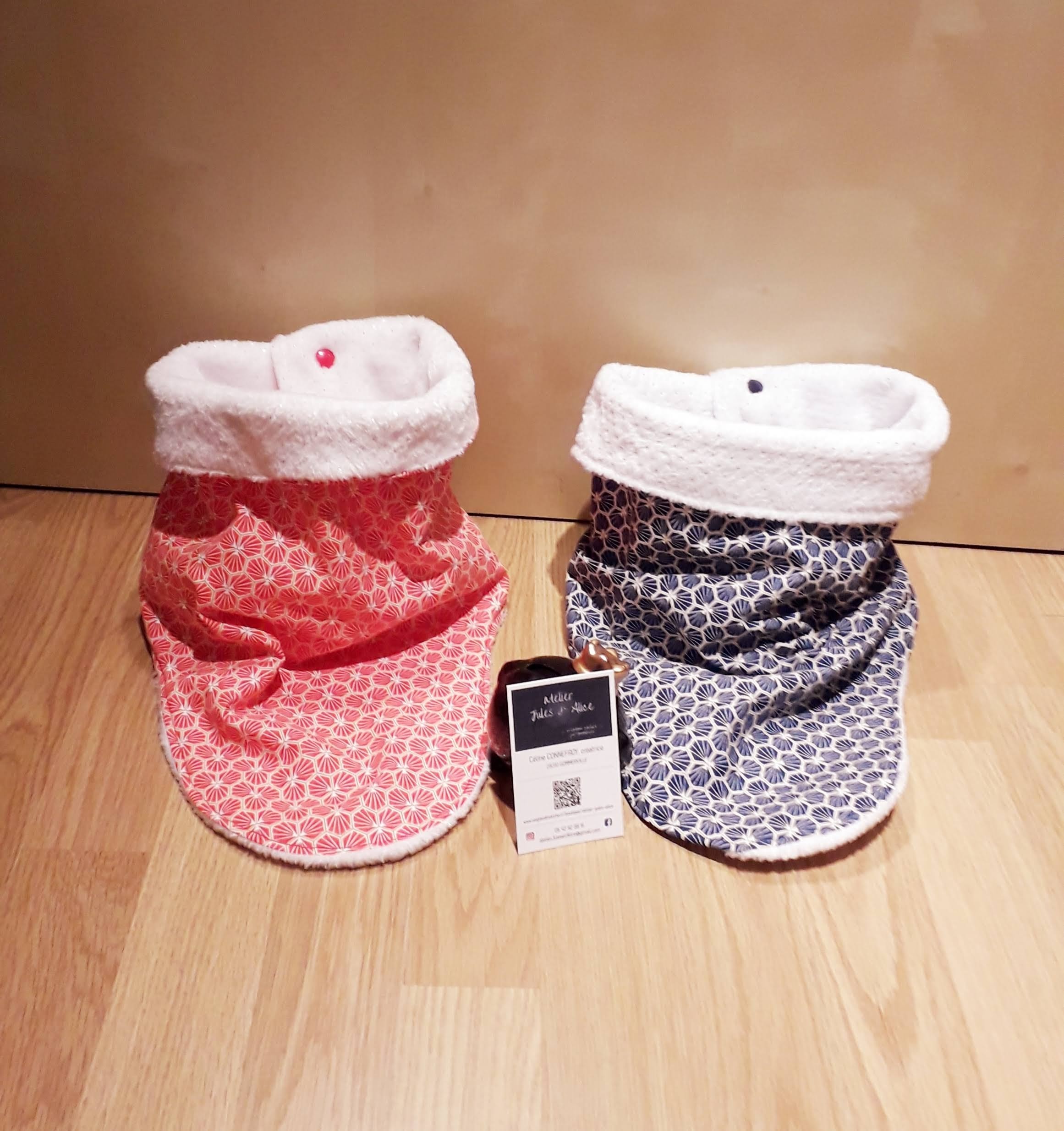 double face: une face en tissu coton à motifs (Liberty ou autre motif) et une face en polaire toute douce!