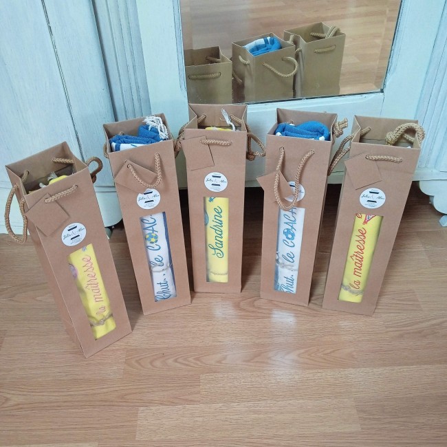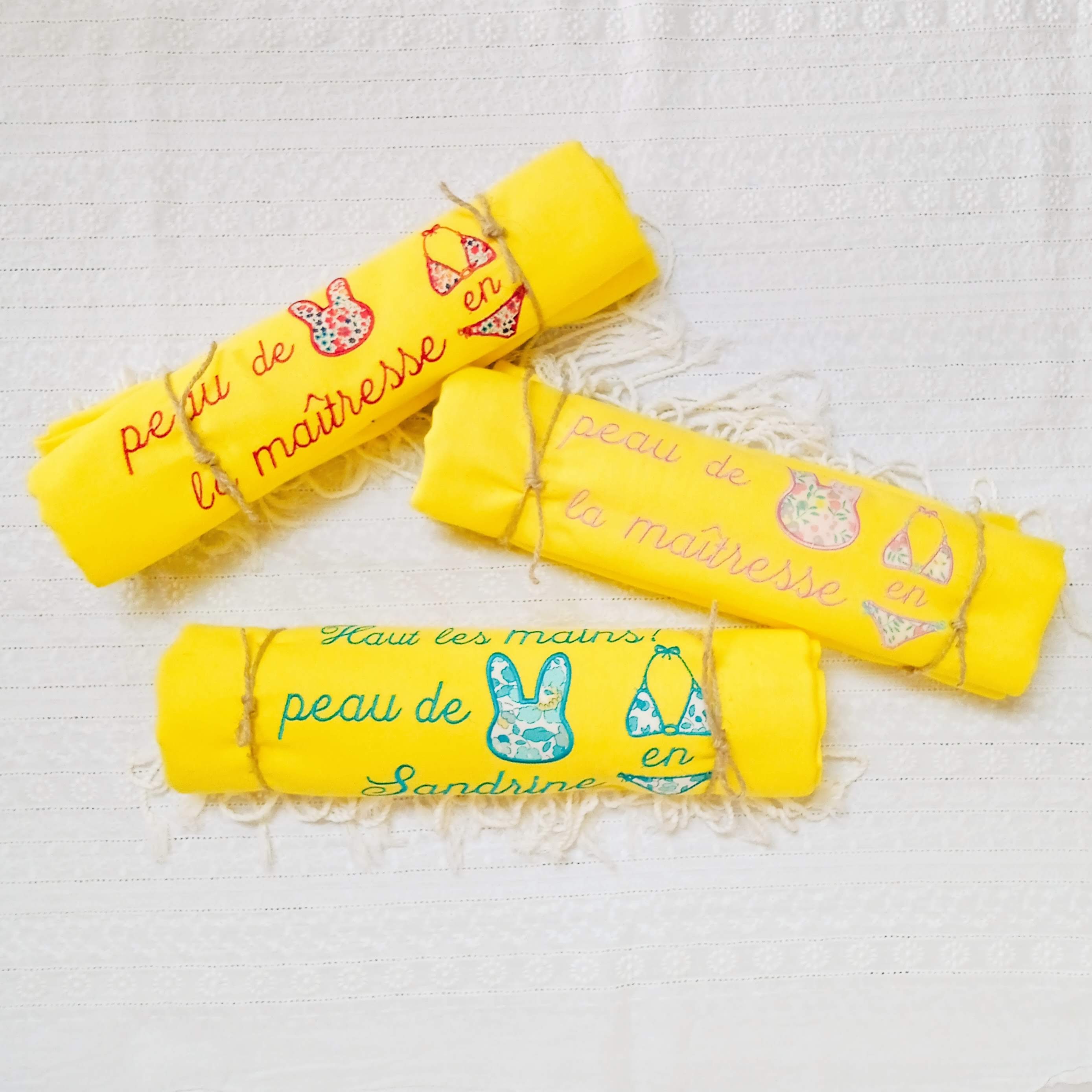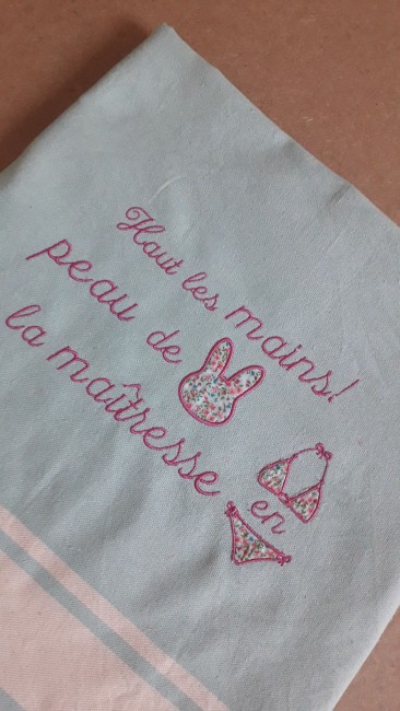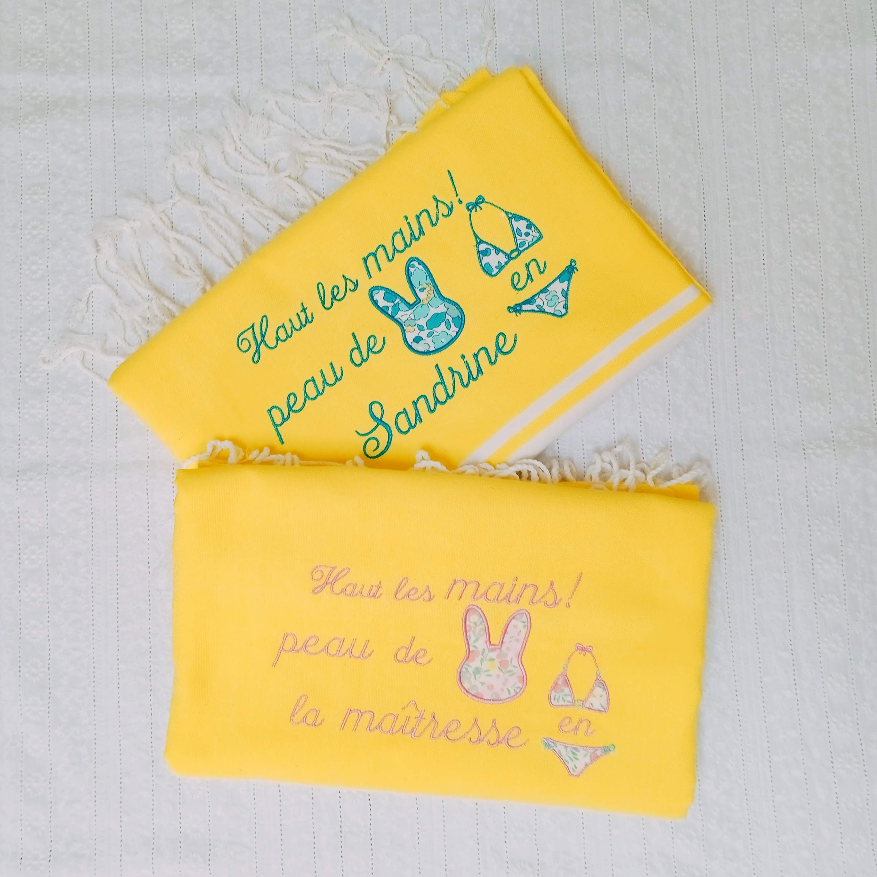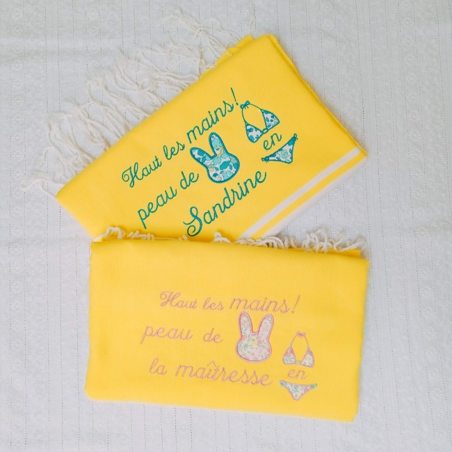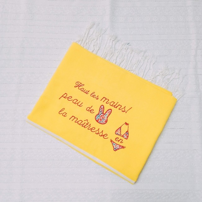Fouta 100% coton, avec franges tressées, broderie: "haut les mains! Peau de lapin, la maitresse en maillot de bain"