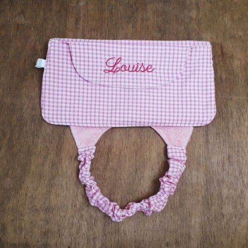 - avec pochette de rangement cousue, rabat brodé du prénom