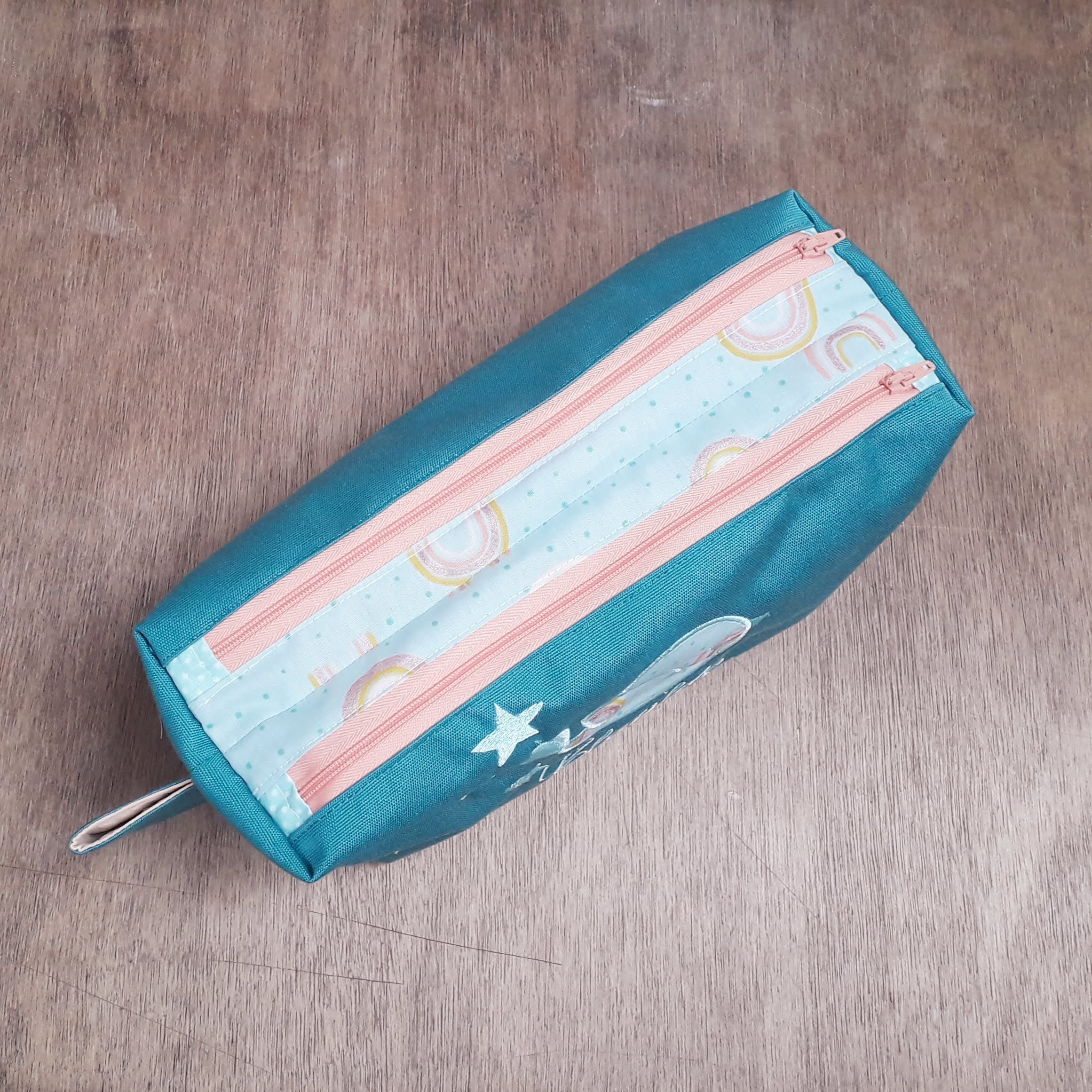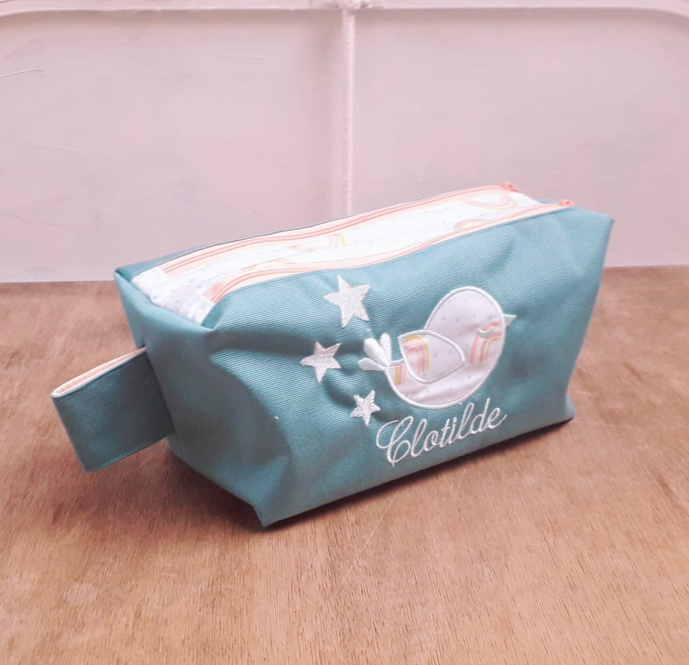 * trousse de toilette Adèle double, simili, doublure coton, broderie pioupiou et prénom 40€