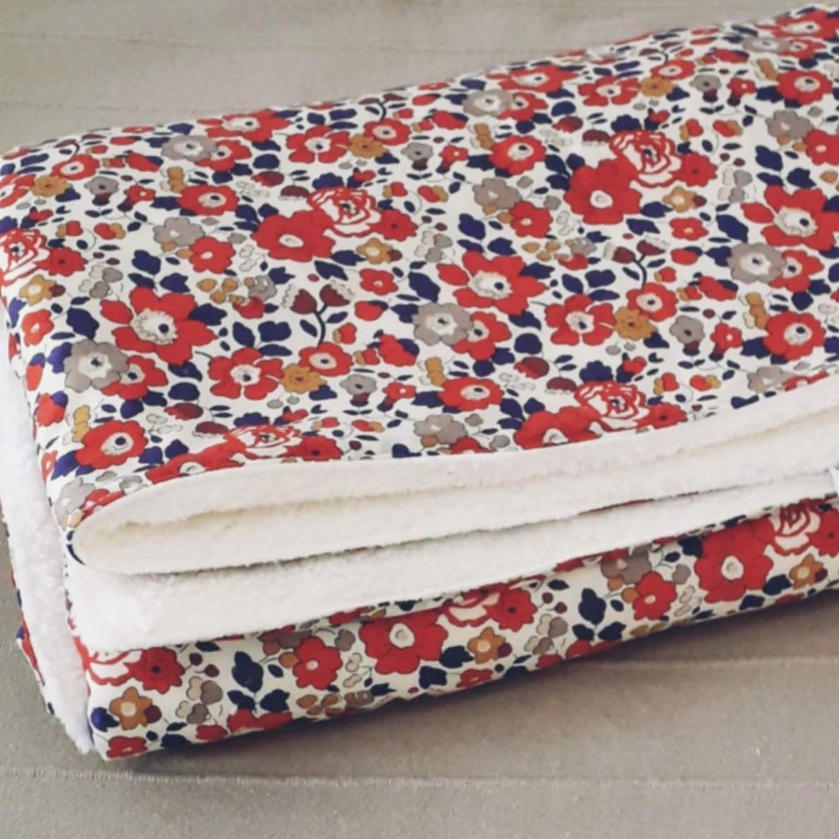 Couverture double face: une face en tissu du motif de votre choix (nombreux liberty disponibles!) et une face en Teddydoux écru très très doux!