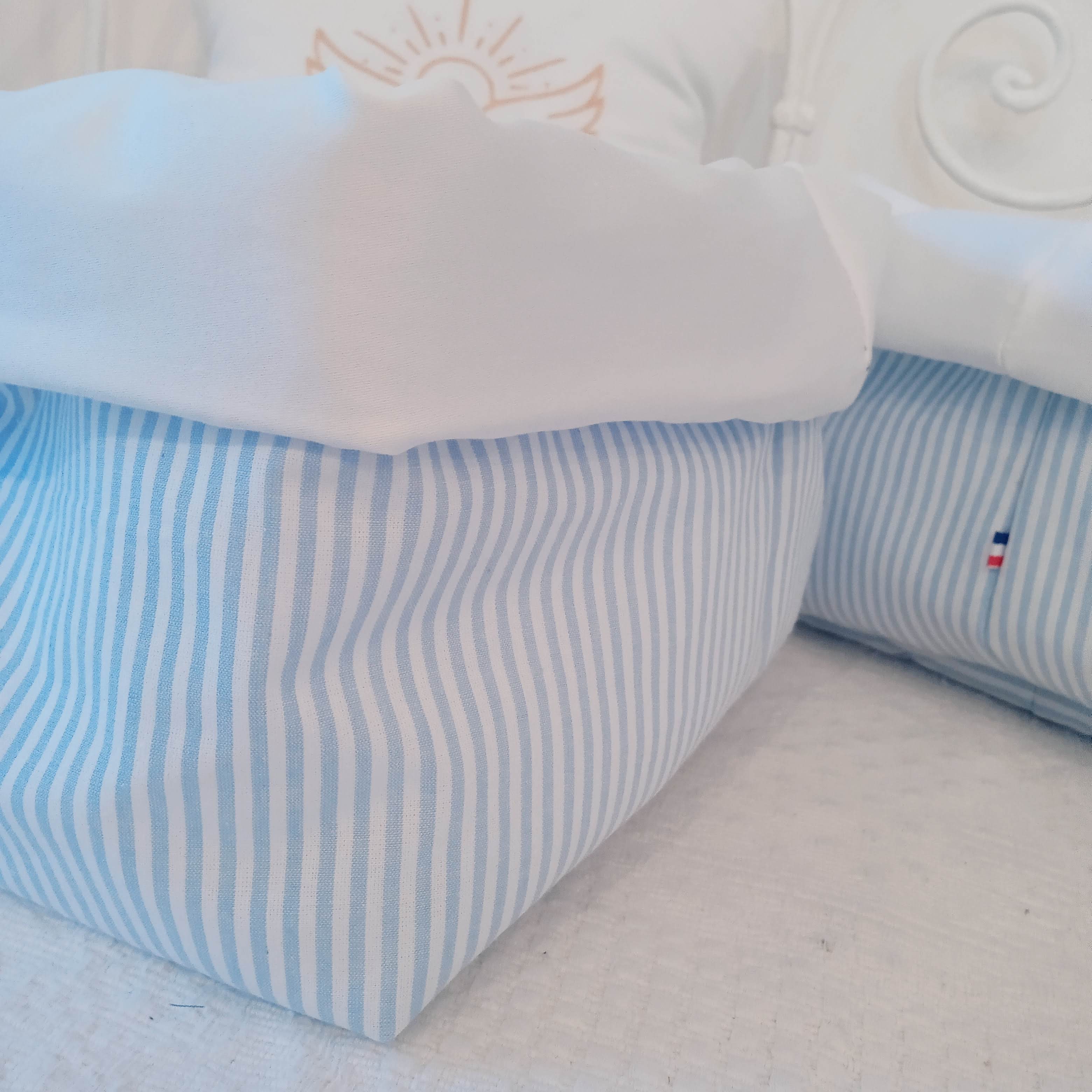 Confectionnés en tissu coton de l'imprimé de votre choix, ils sont entièrement doublés de coton uni, et dotés d'une triplure en molleton leur conférant une jolie tenue ainsi qu'un aspect coccon très délicat.
