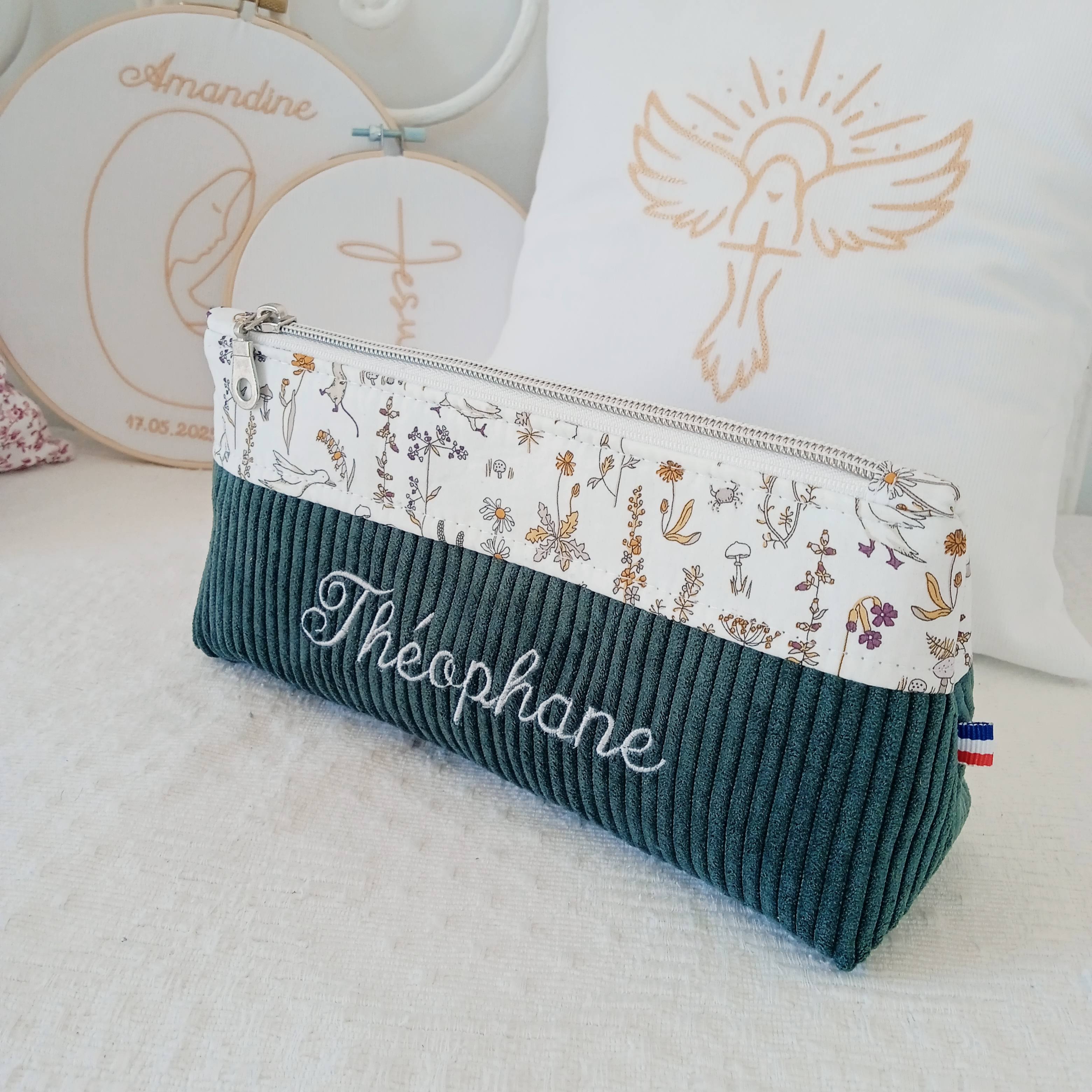 Trousse bi matière: bas en velours côtelé qualité ameublement, très résitant! haut de la trousse en tissu à motif (Liberty ou non)