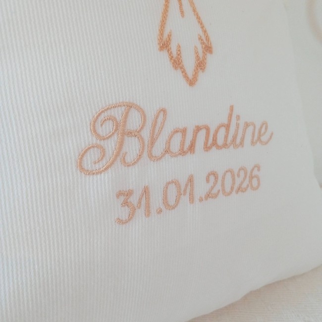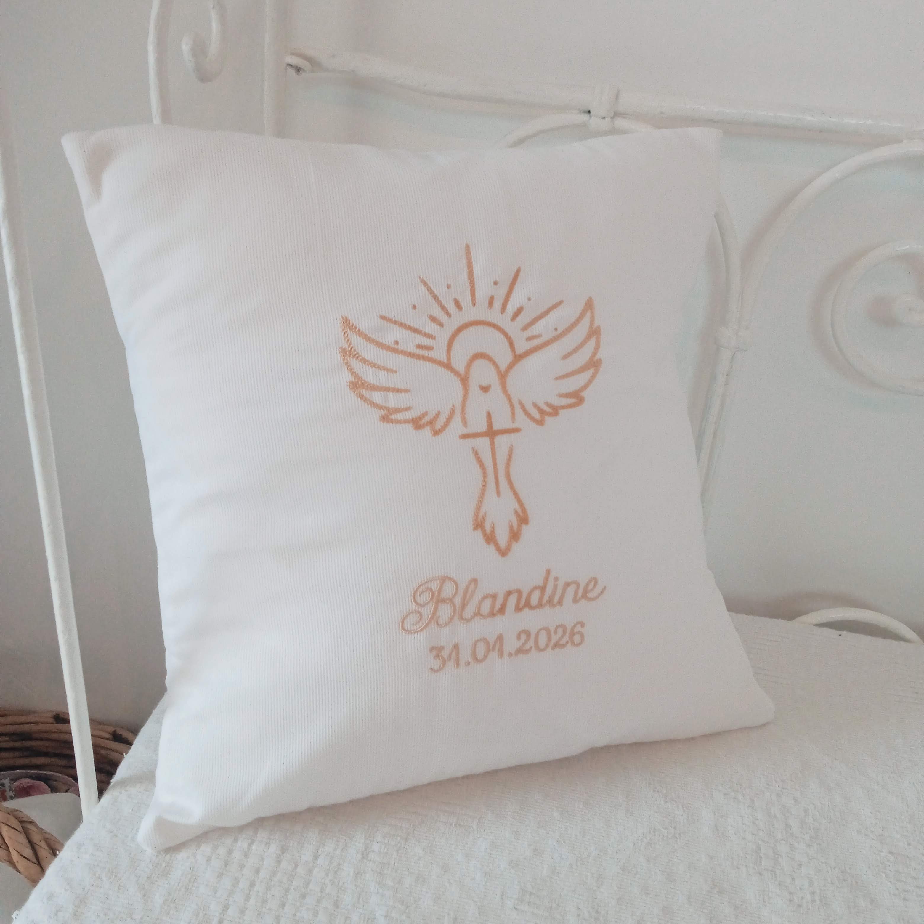 Ce coussin peut également être personnalisé avec l'ajout de la date du sacrement et / ou du prénom