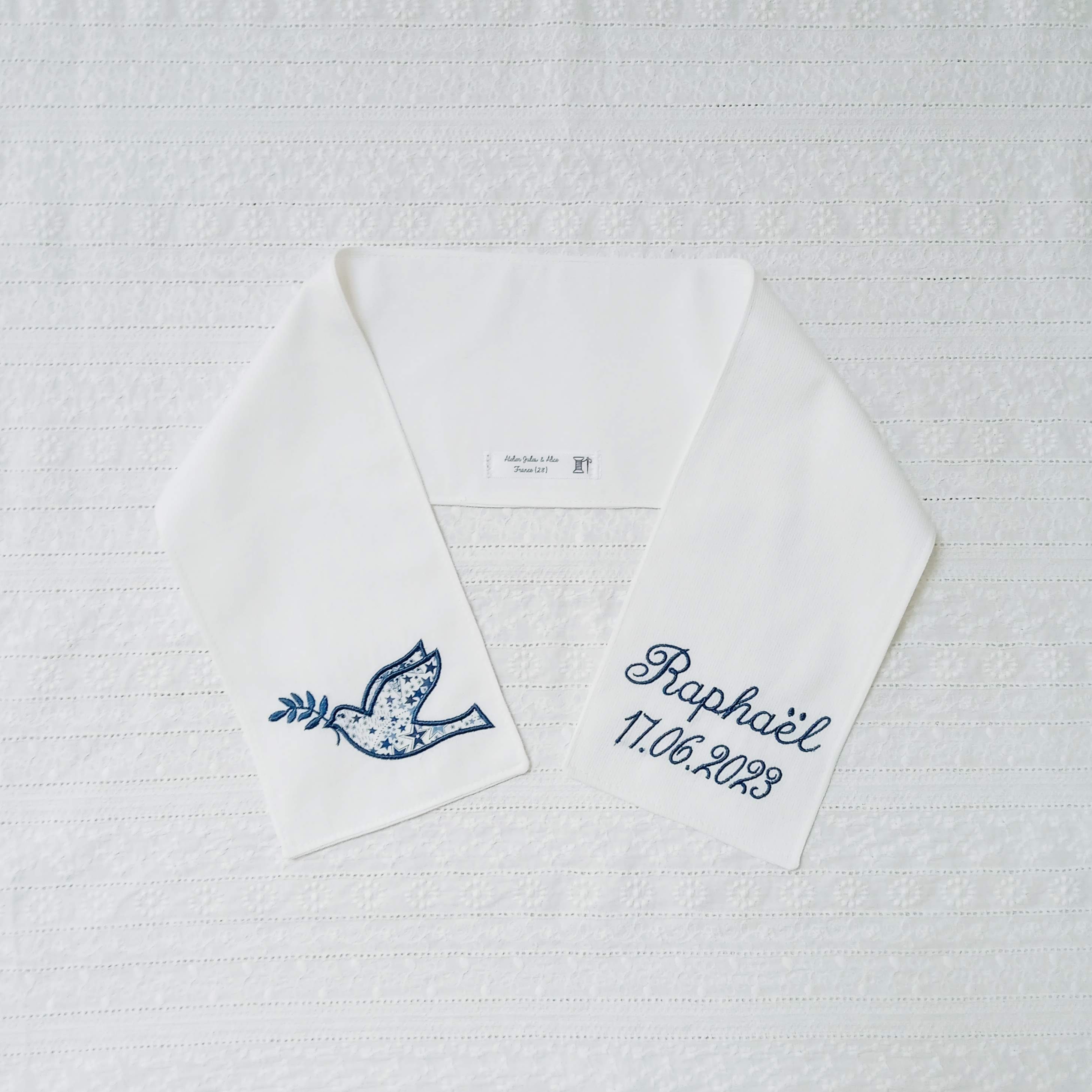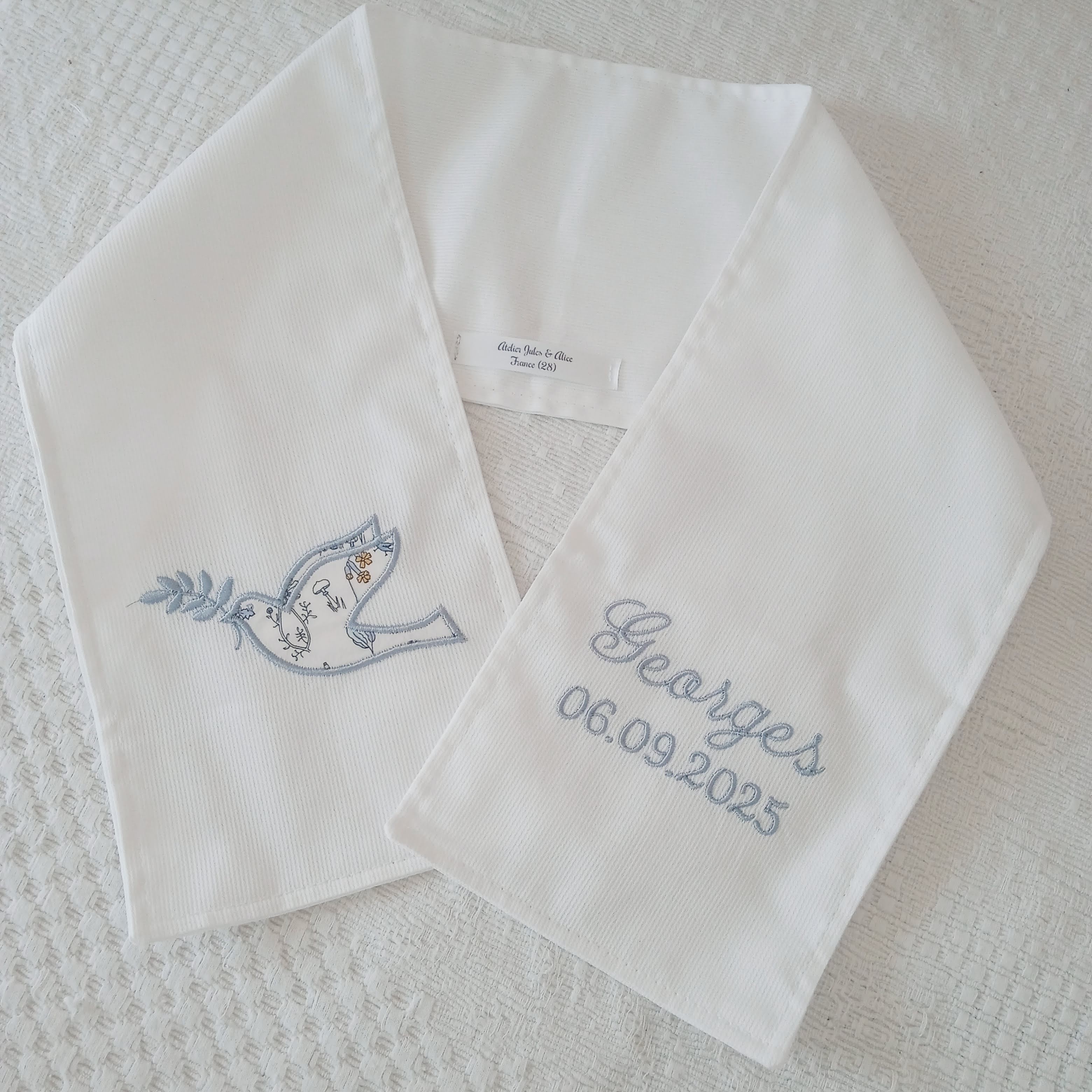 possibilité de broder la date en tout petit sous la colombe.