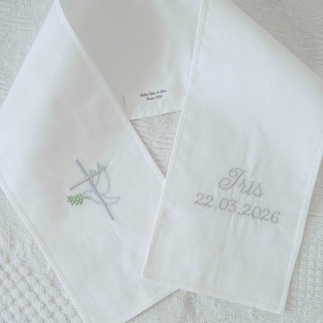 La broderie peut également être personnalisée avec le prénom de l’enfant et la date du baptême, pour faire de l’écharpe un souvenir unique et chargé de sens, que l’on conserve précieusement toute la vie.
