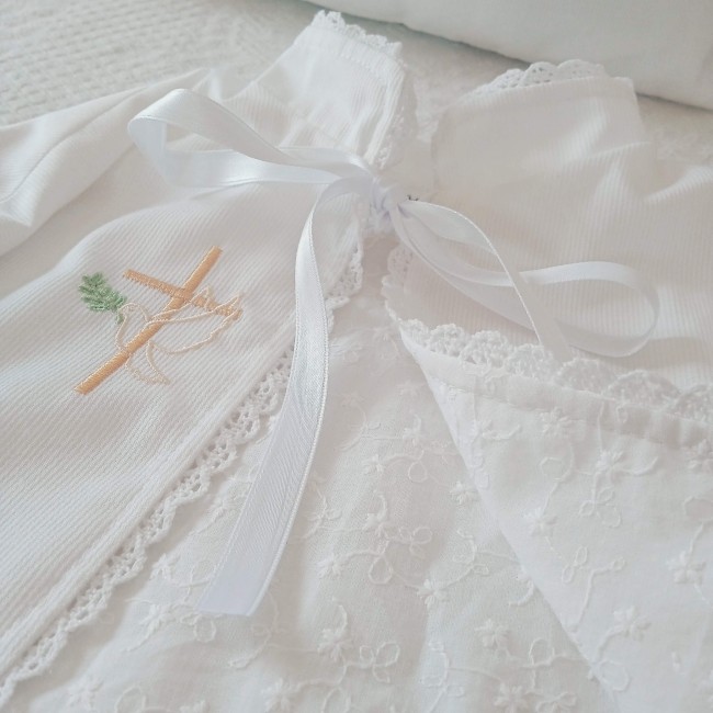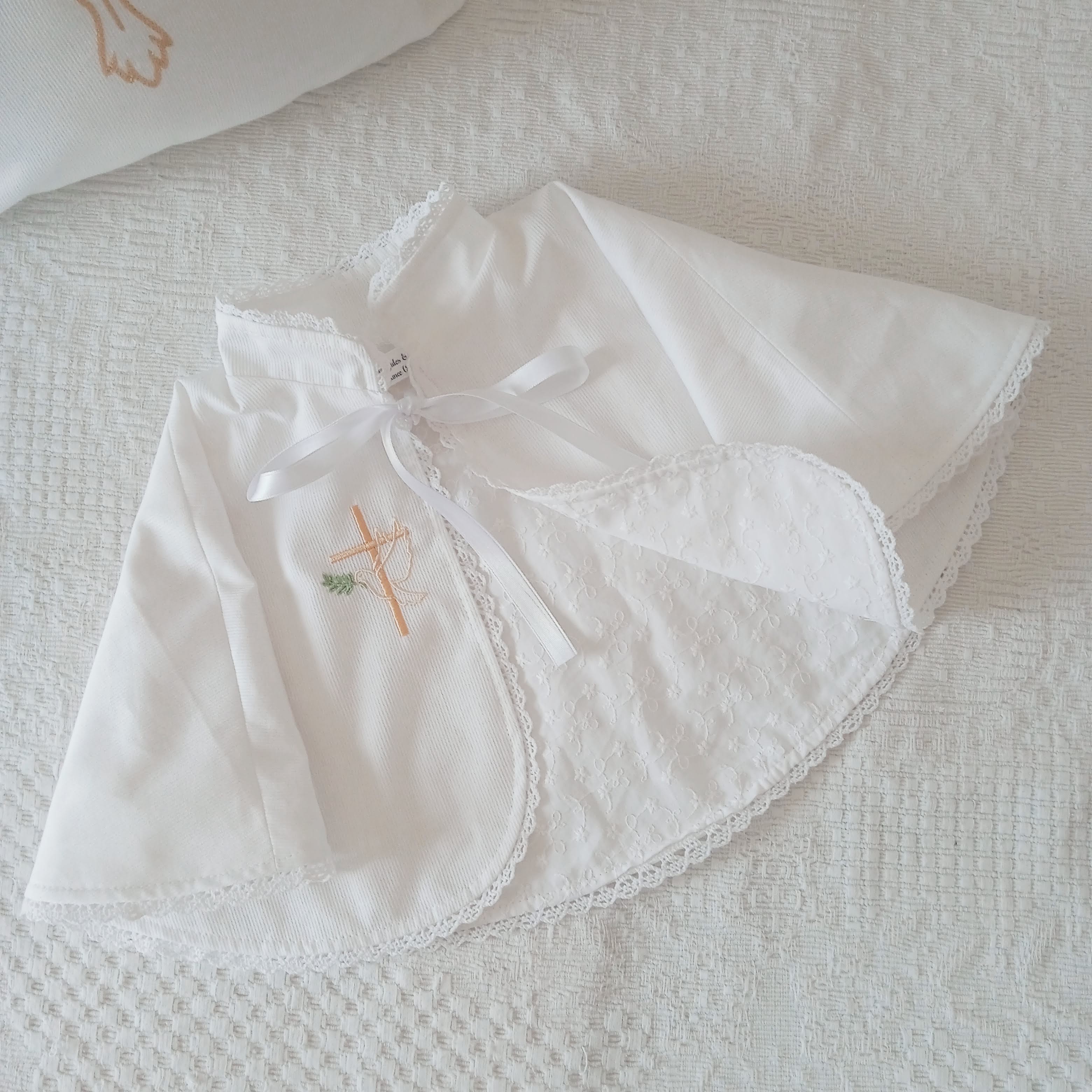Cette cape de baptême personnalisable peut être brodée avec le prénom de votre enfant, la date du sacrement ou un petit motif religieux. Pour un style plus discret et réutilisable, il est possible de choisir uniquement un motif religieux (ou aucun!), idéal pour que la cape soit utilisée par les frères et sœurs ou transmise au sein de la famille, créant ainsi un héritage familial.