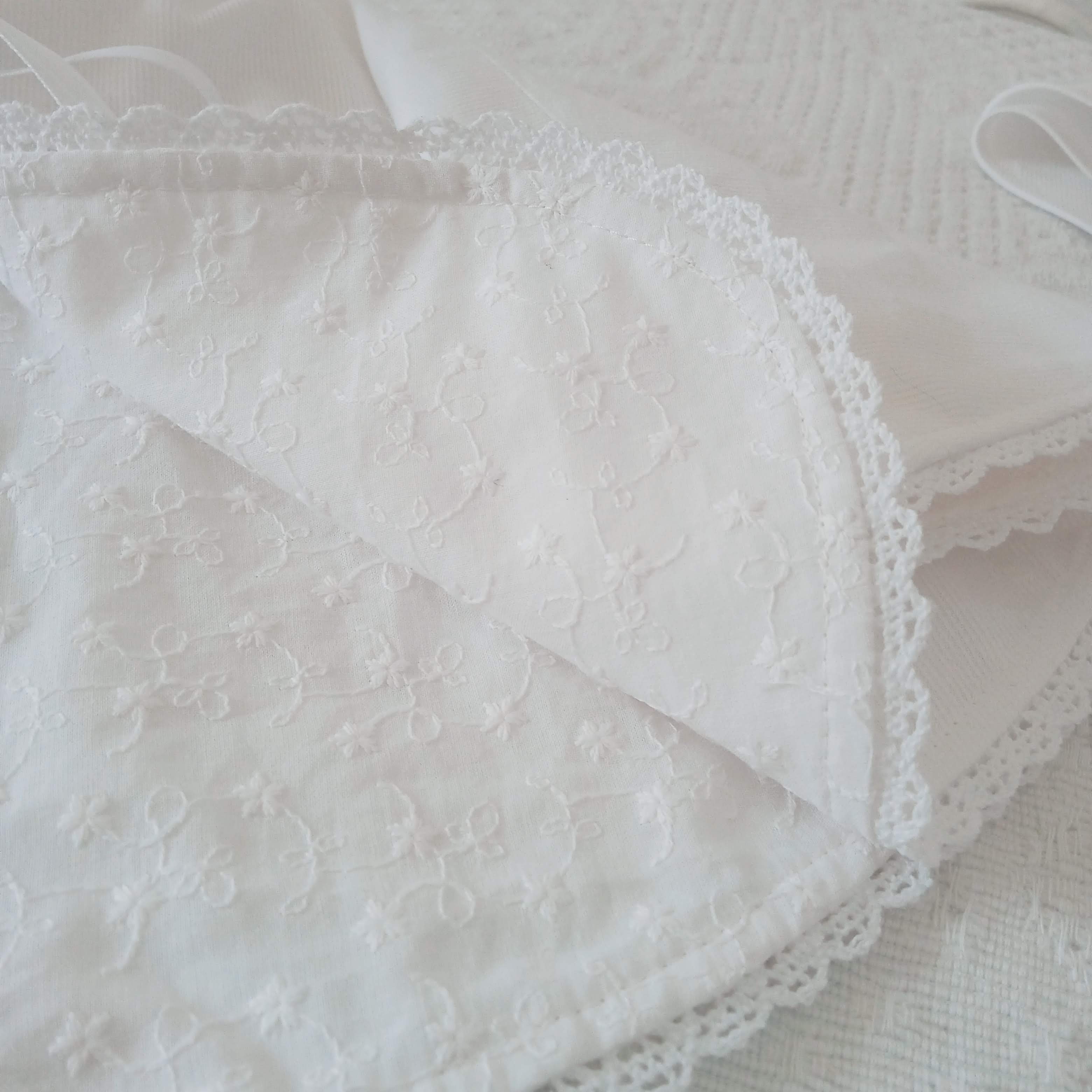 - entièrement doublée de broderie anglaise blanche (le motif de la broderie peut différer selon les arrivages et mon stock, contactez moi si vous souhaitez avoir la précision du motif que j'utiliserai).