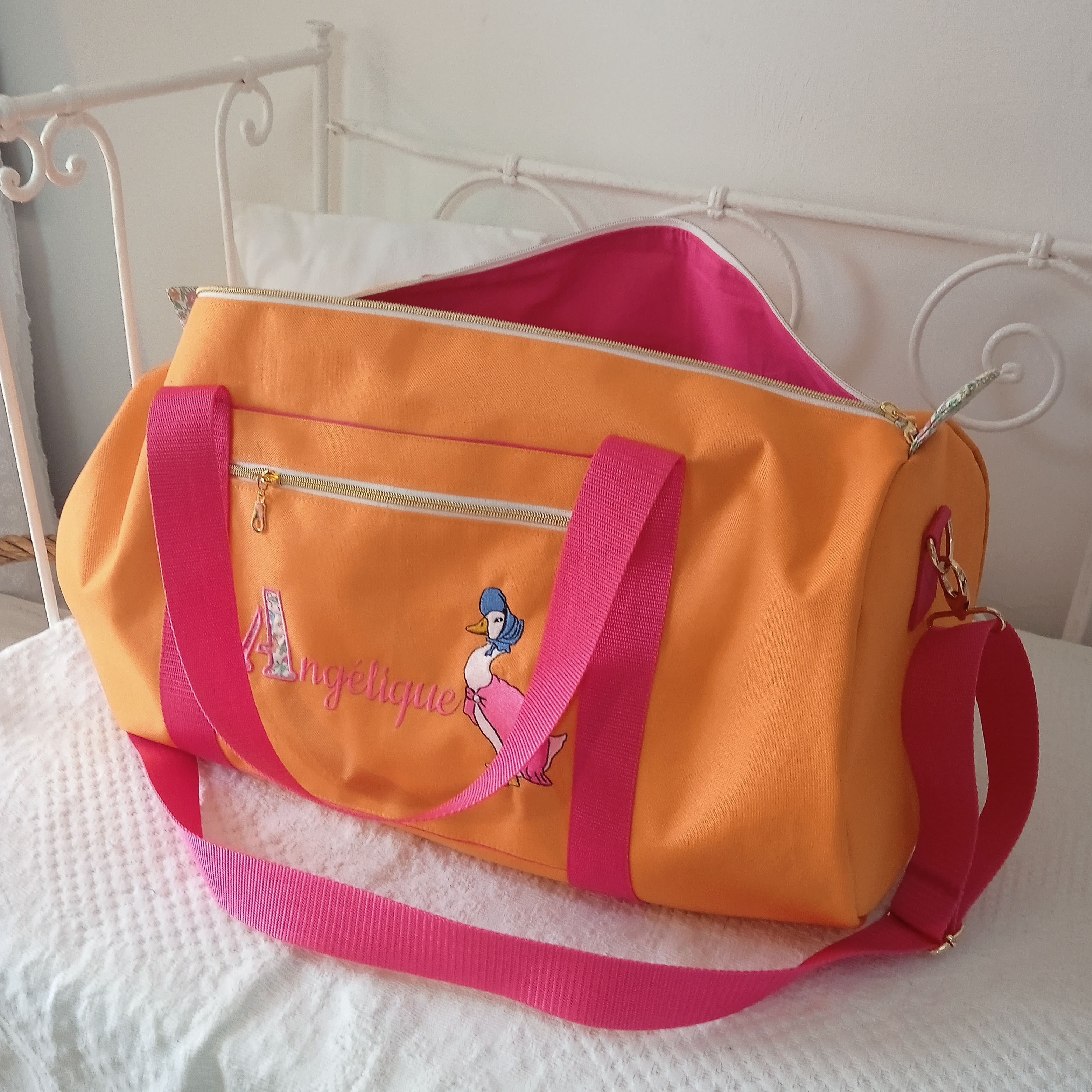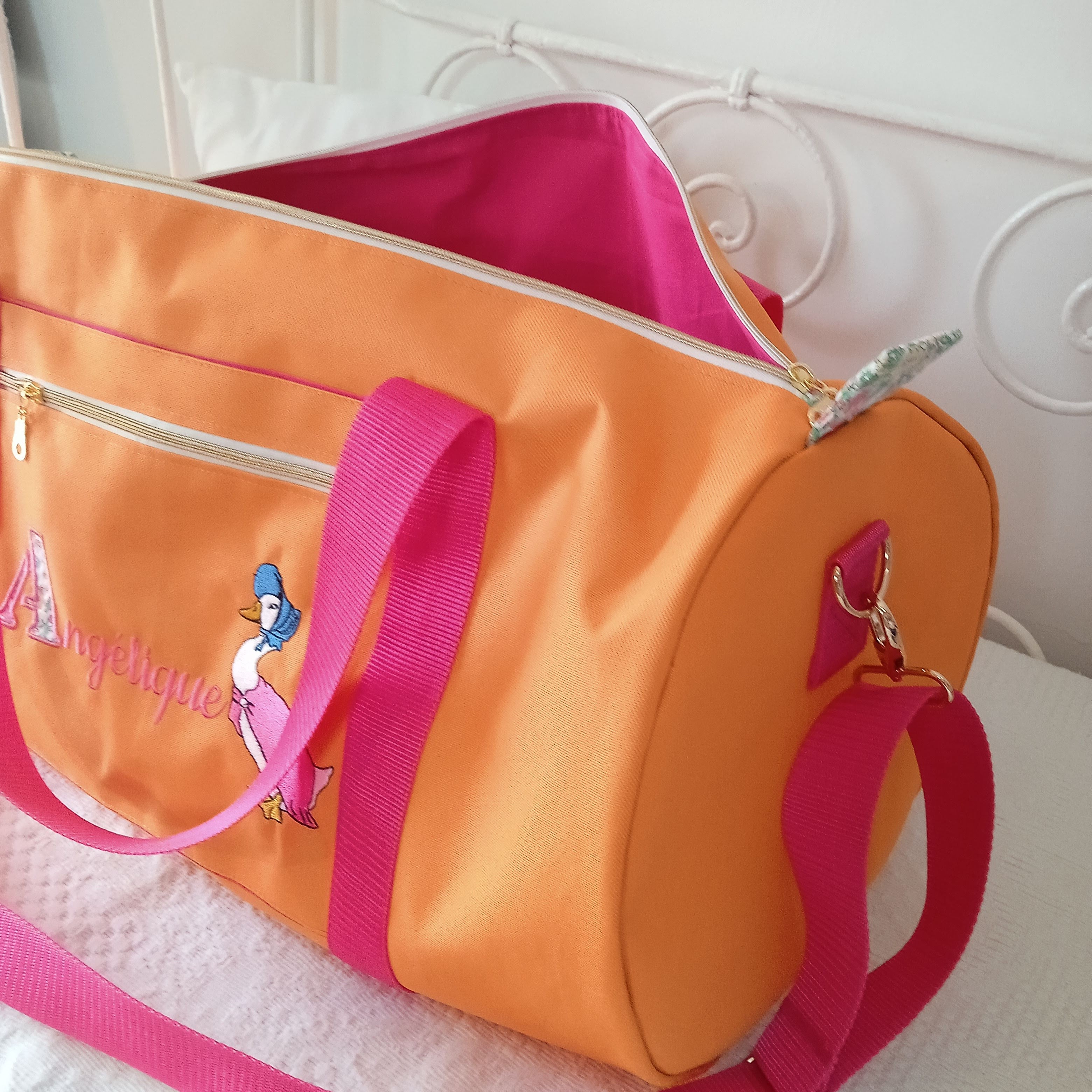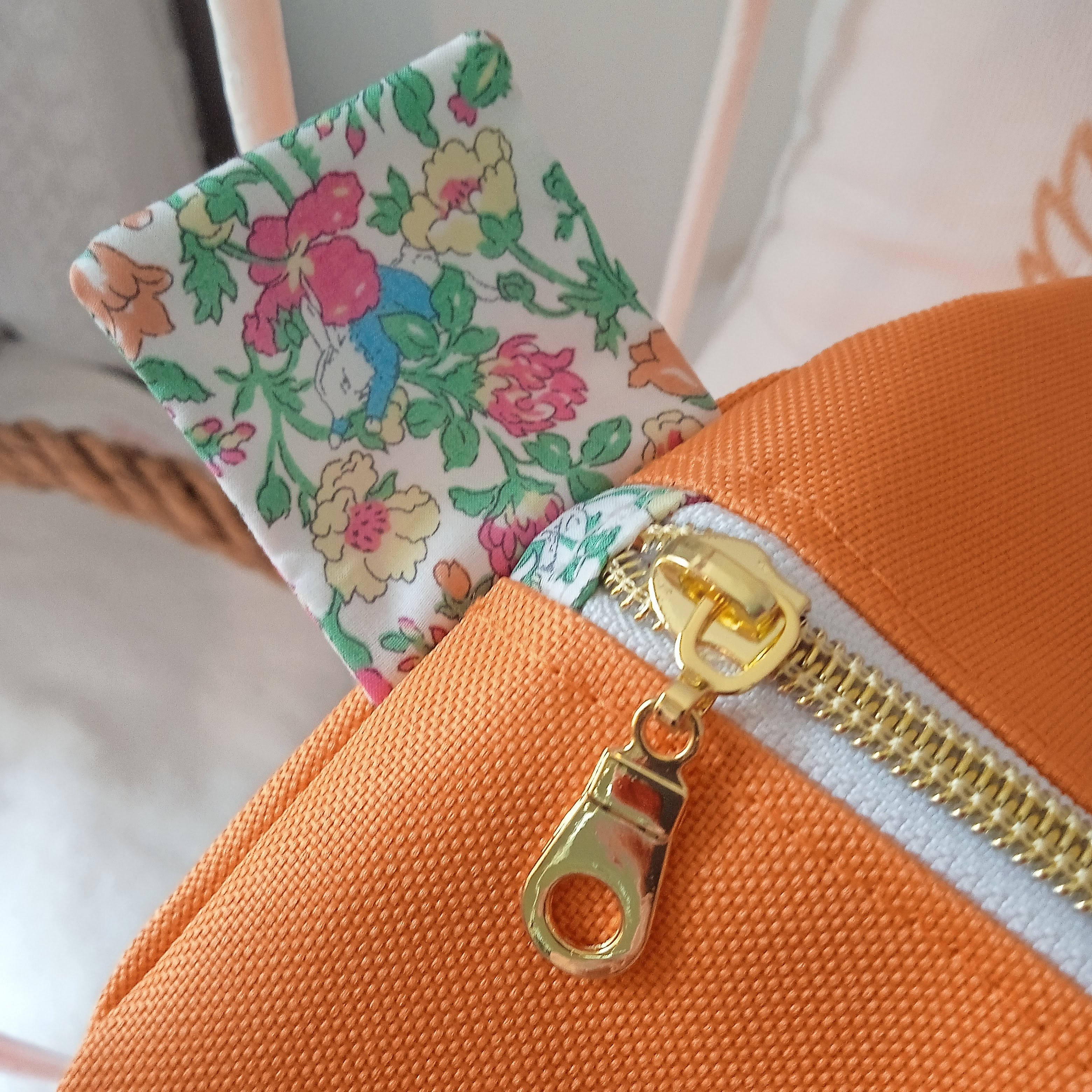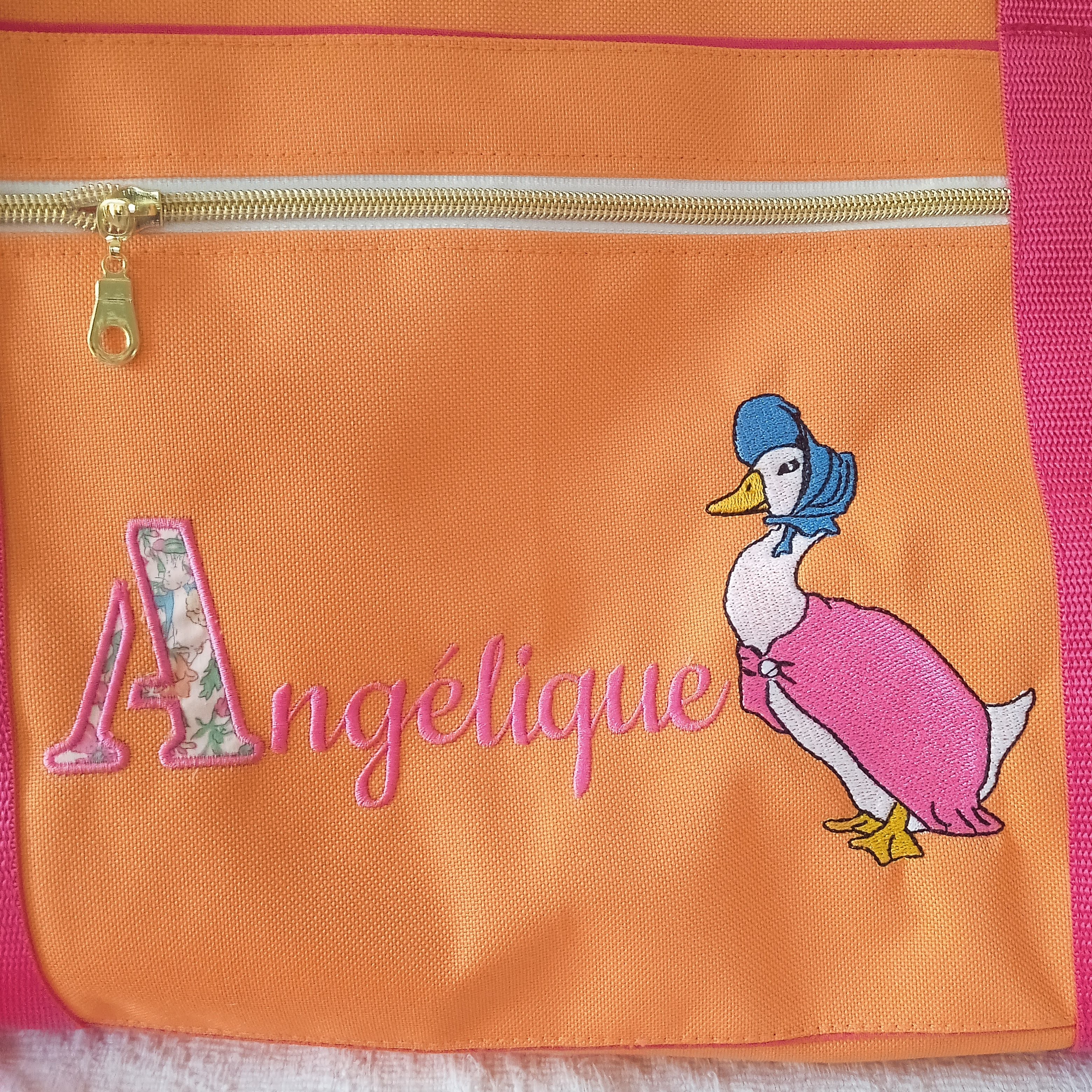 poche zippée plaquée sur le devant, avec broderie Majuscule en appaliqué + prénom + dessin Beatrix Potter