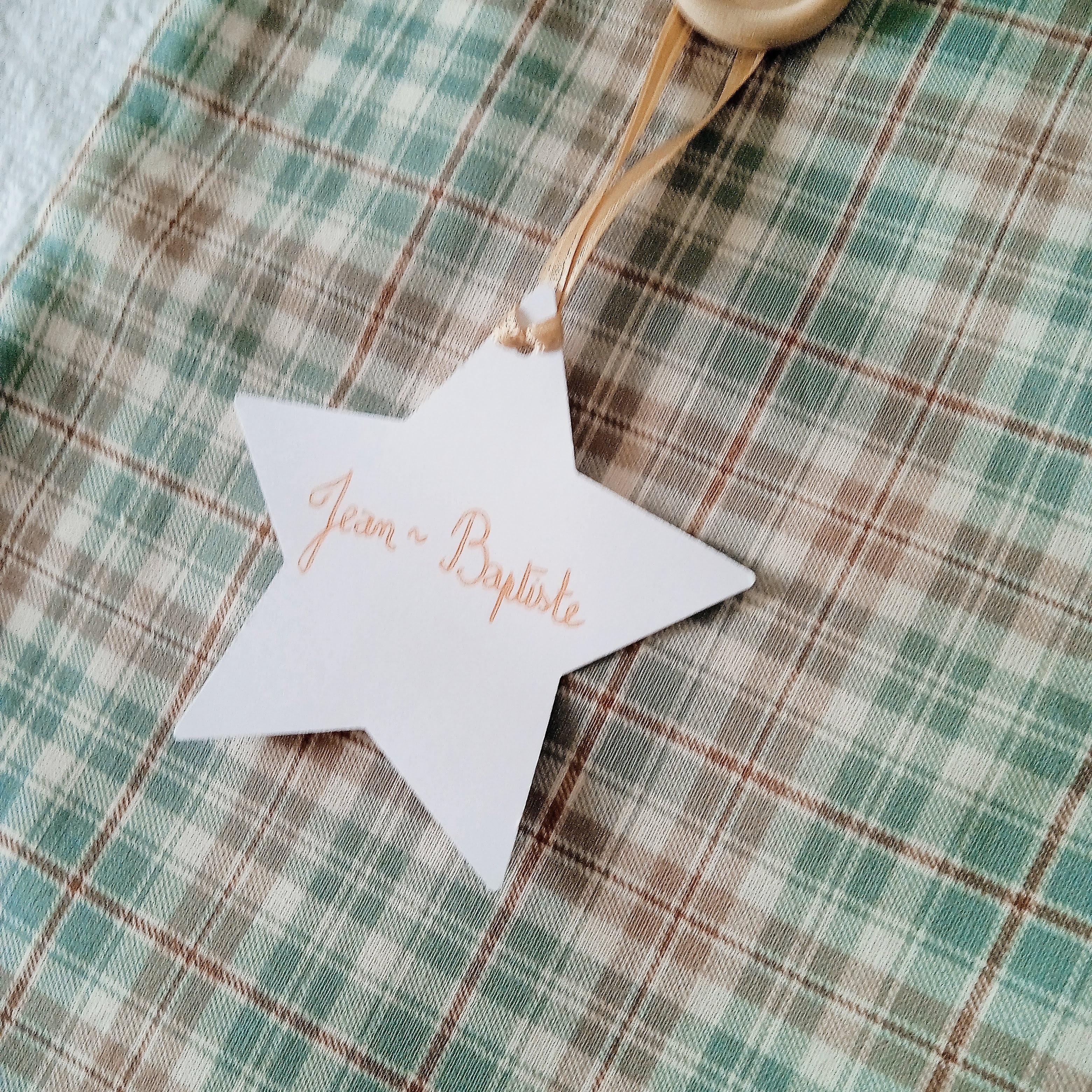 * version personnalisée avec un bouton bois cousu et une étiquette en papier épais en forme d'étoile, avec un prénom écrit dessus.
