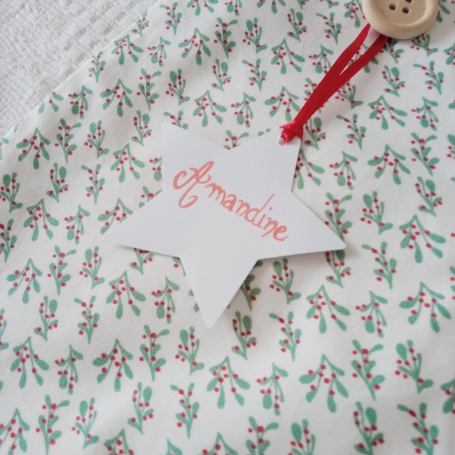 * version personnalisée avec un bouton bois cousu et une étiquette en papier épais en forme d'étoile, avec un prénom écrit dessus.