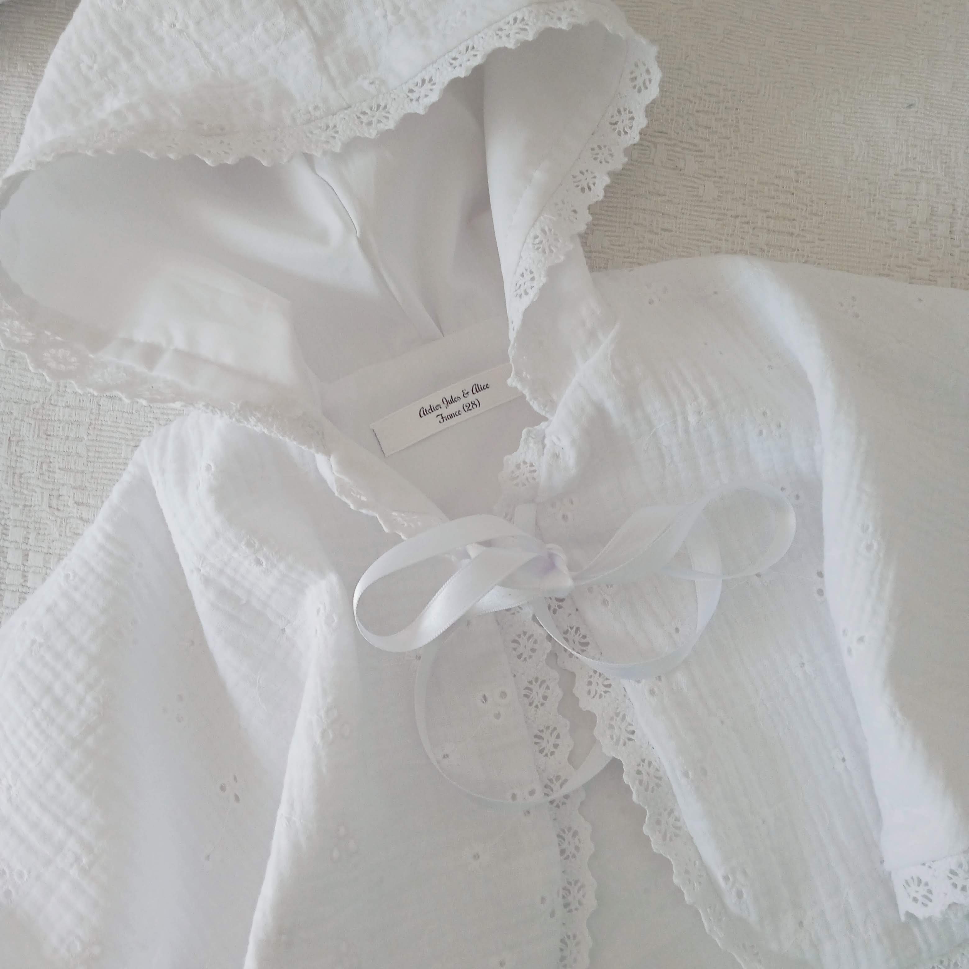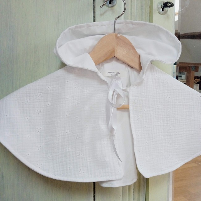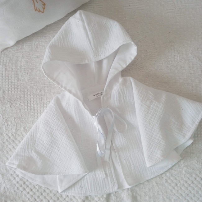 Cape de baptême avec capuche en double gaze de coton brodée et ajourée