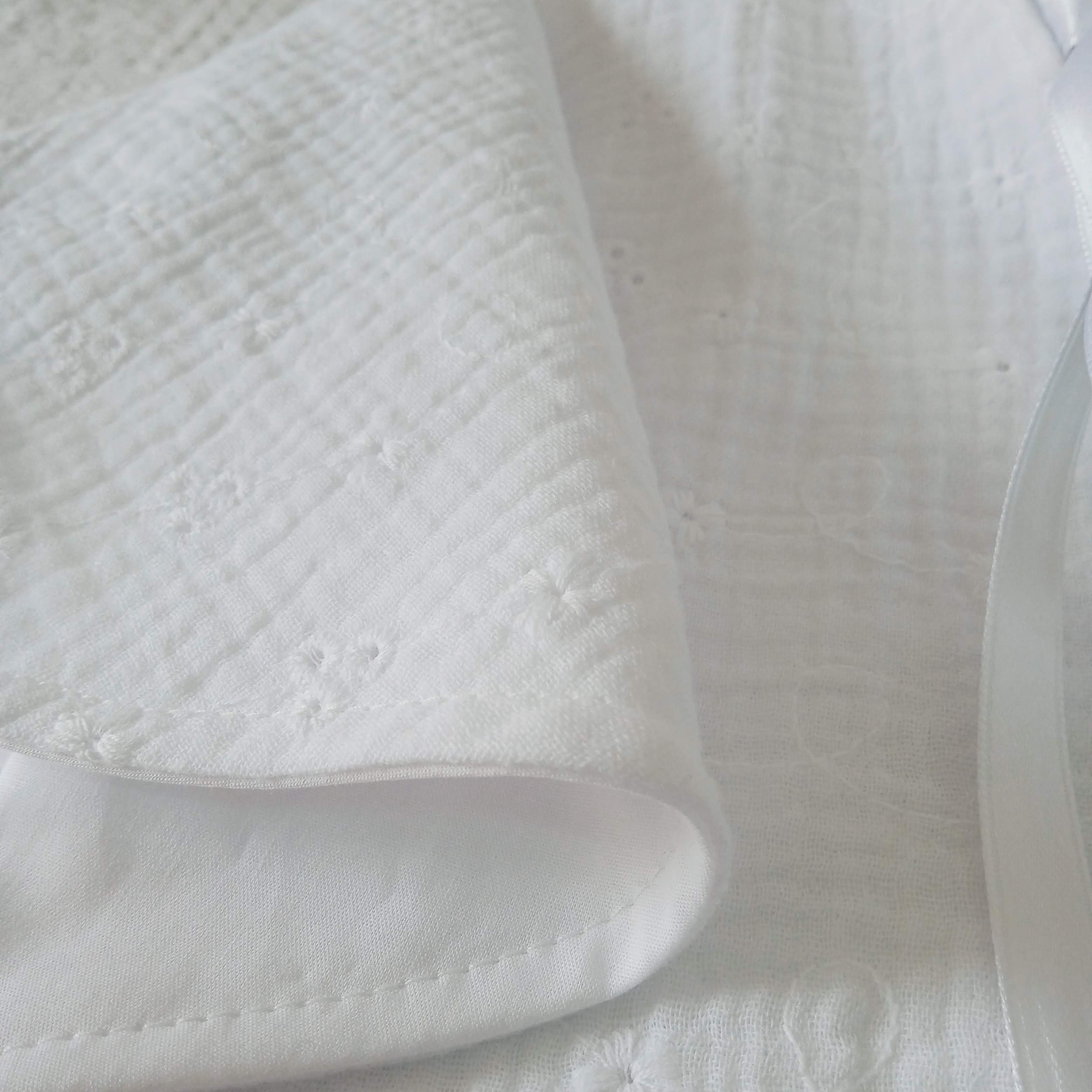 Extérieur en double gaze de coton blanche délicatement brodée et très légèrement ajourée (façon broderie anglaise).