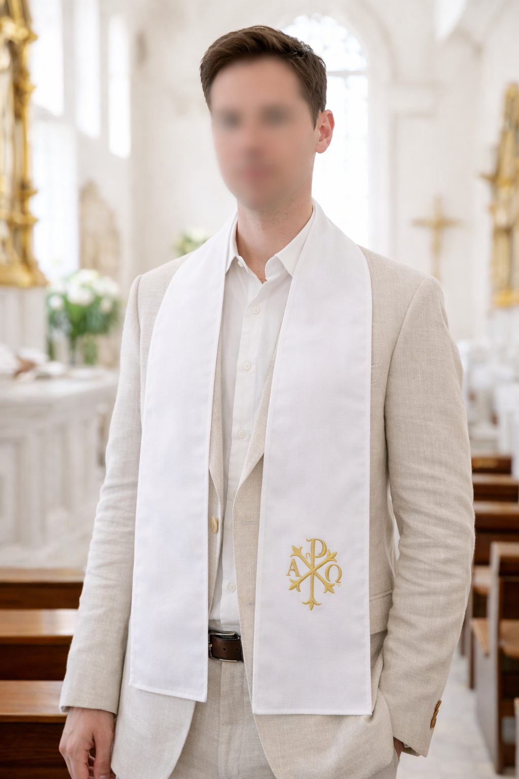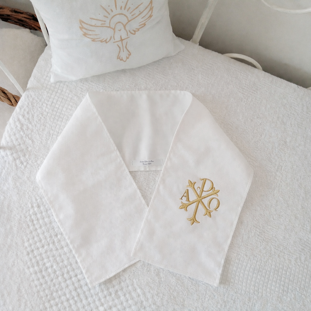 Ces écharpes de baptême religieuses sont ornées d’une broderie fine du chrisme, symbole chrétien ancien et chargé de sens. Le chrisme est formé par l’entrelacement des lettres grecques Chi (X) et Rhô (P), premières lettres du mot « Christ », et représente la présence du Christ et sa victoire sur la mort. Souvent accompagné de l’alpha et de l’oméga, il rappelle que le Christ est « le commencement et la fin ». Brodé en blanc, ce symbole apporte à l’écharpe une dimension spirituelle délicate et raffinée, parfaite pour un souvenir de baptême personnalisé.