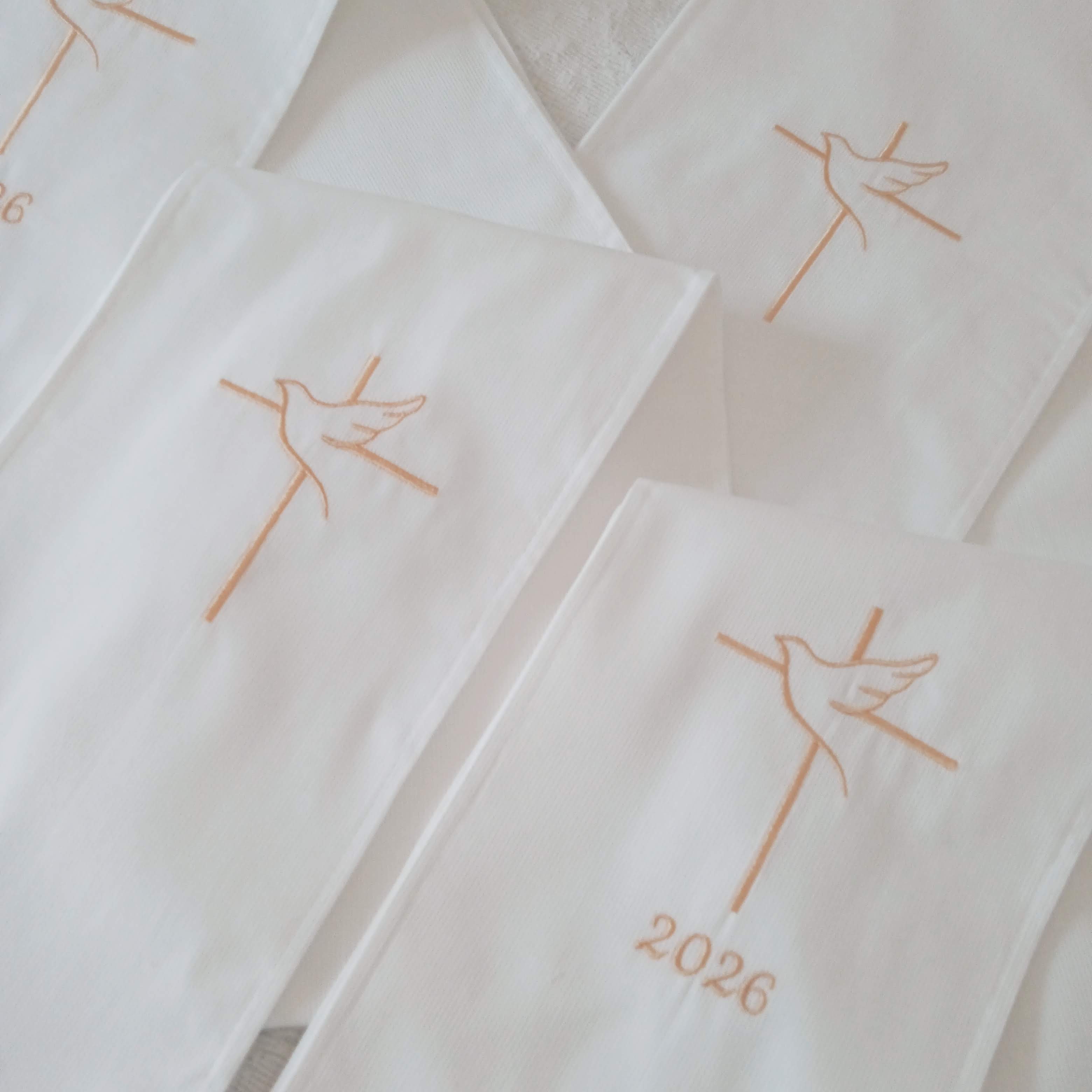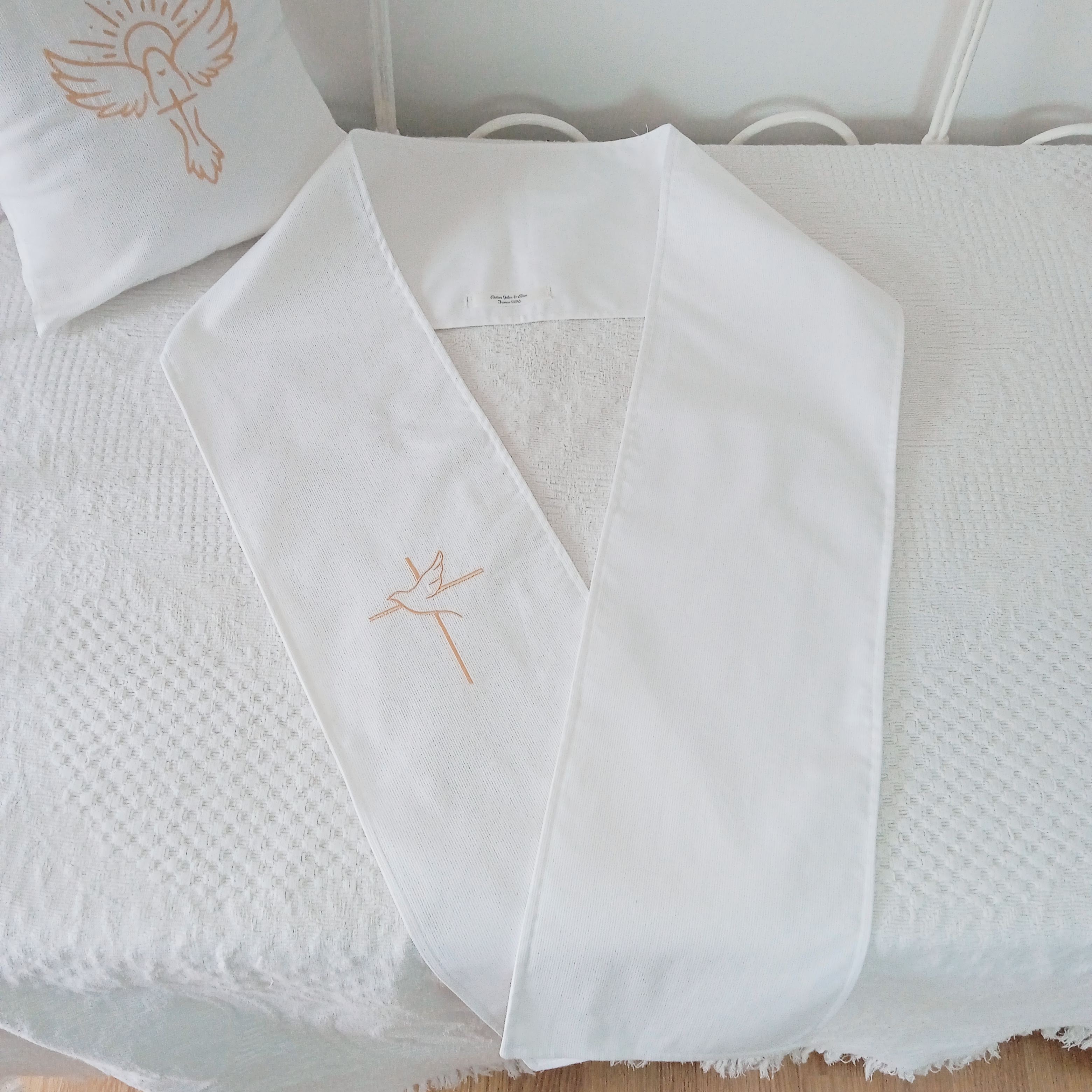 Ces écharpes de baptême religieuses sont ornées d’une broderie fine d'une croix chrétienne et d'une colombe, dans un style très épuré. Ce symbole est particulièrement adapté pour les baptêmes d'adolescents et d'adultes, car très simple et discret. Brodé en blanc, ce symbole apporte à l’écharpe une dimension spirituelle délicate et raffinée, parfaite pour un souvenir de baptême personnalisé.