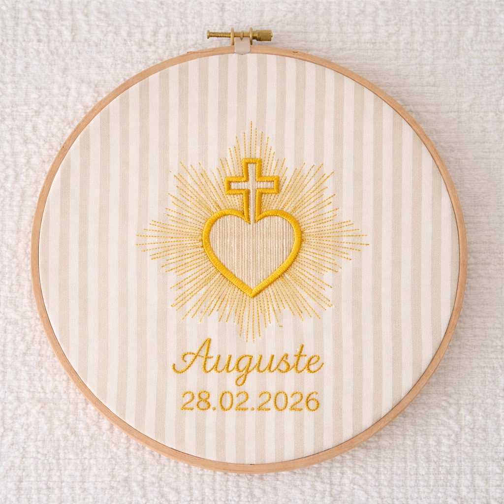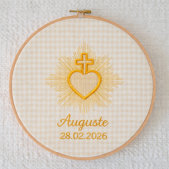 Les rayons lumineux brodés autour du cœur expriment la grâce qui rayonne et éclaire les vies. Ce symbole fort accompagne les familles chrétiennes depuis des générations comme signe de confiance et d’abandon à Dieu.