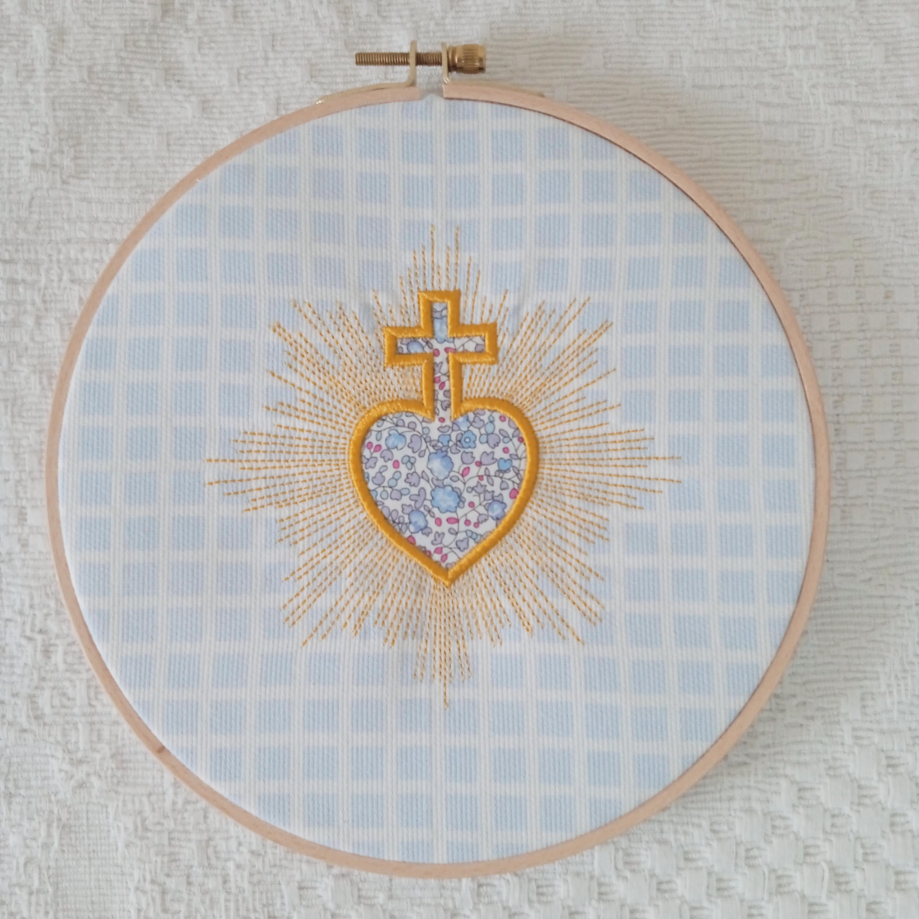 Les rayons lumineux brodés autour du cœur expriment la grâce qui rayonne et éclaire les vies. Ce symbole fort accompagne les familles chrétiennes depuis des générations comme signe de confiance et d’abandon à Dieu.