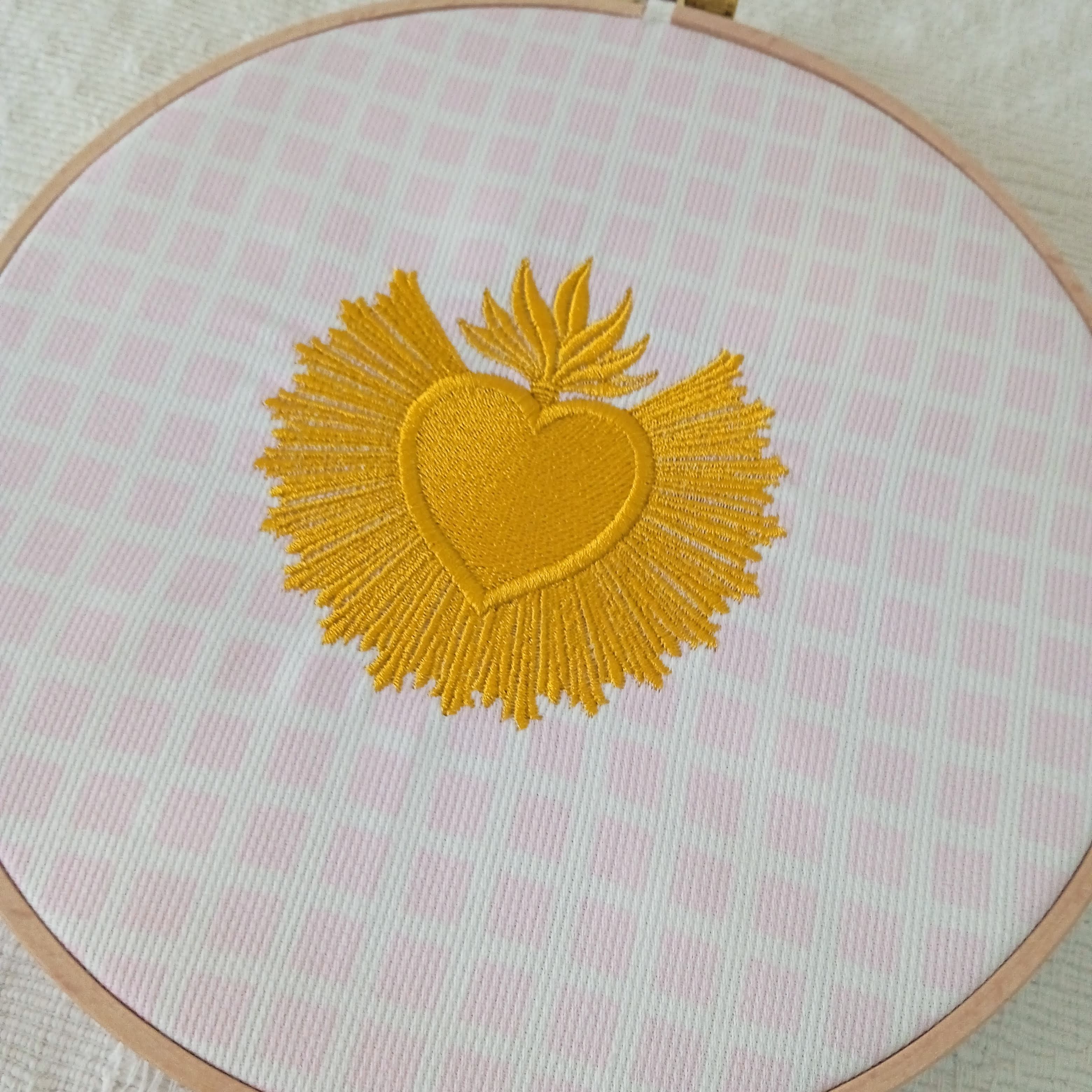 Le cercle en bois naturel met en valeur la broderie dorée du cœur flamboyant et s’intègre harmonieusement dans une décoration intérieure, qu’elle soit classique, romantique ou contemporaine.