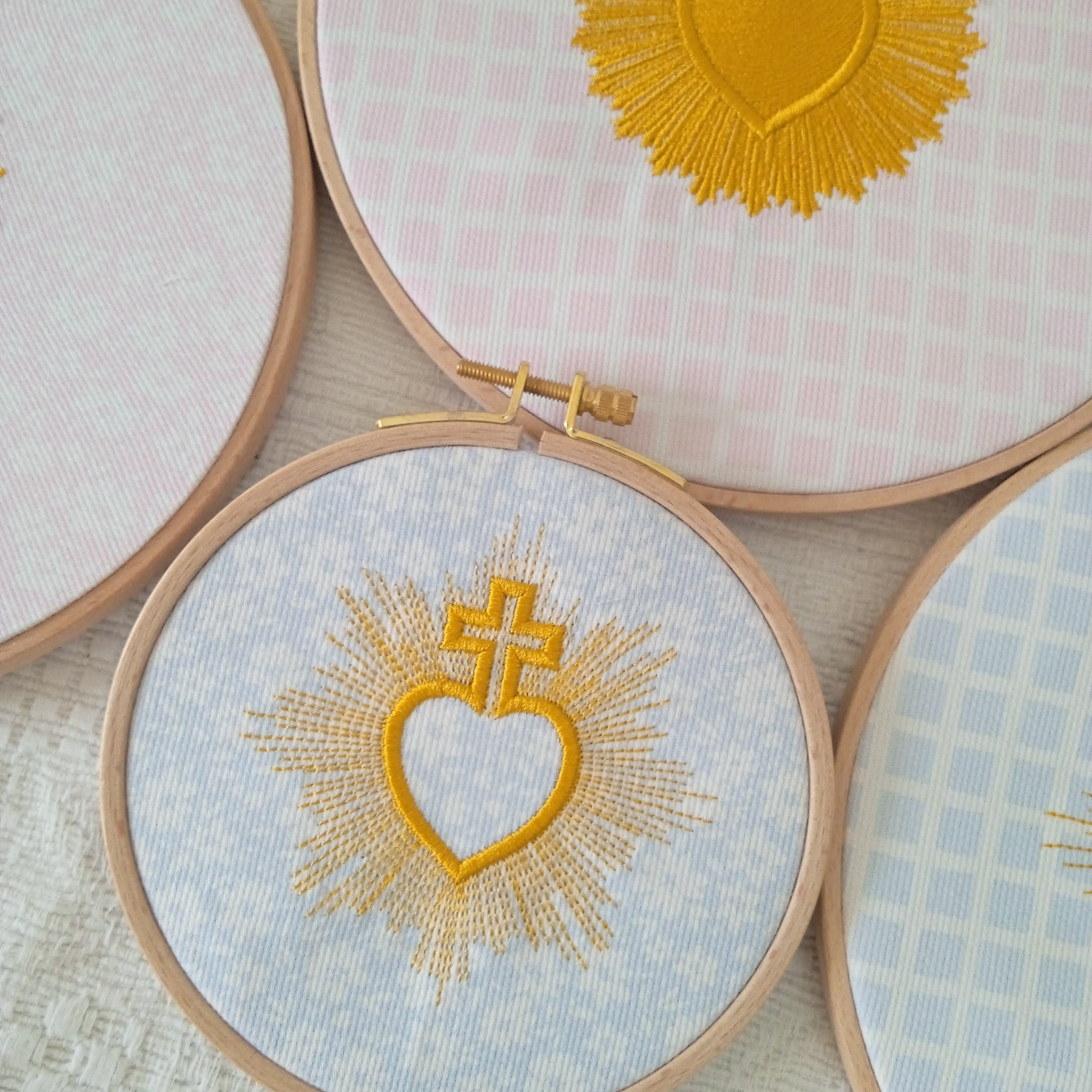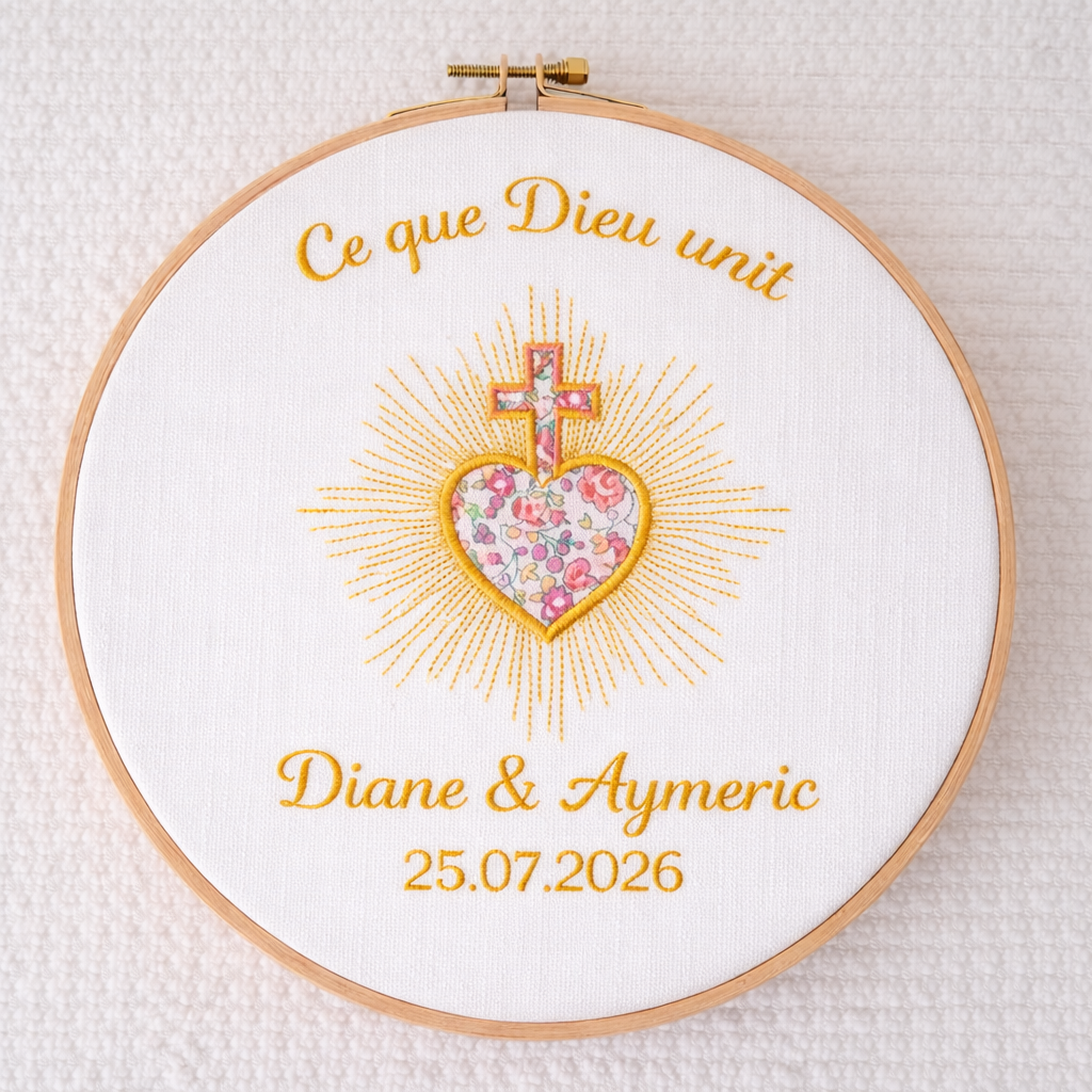 Les rayons lumineux brodés autour du cœur expriment la grâce qui rayonne et éclaire les vies. Ce symbole fort accompagne les familles chrétiennes depuis des générations comme signe de confiance et d’abandon à Dieu.