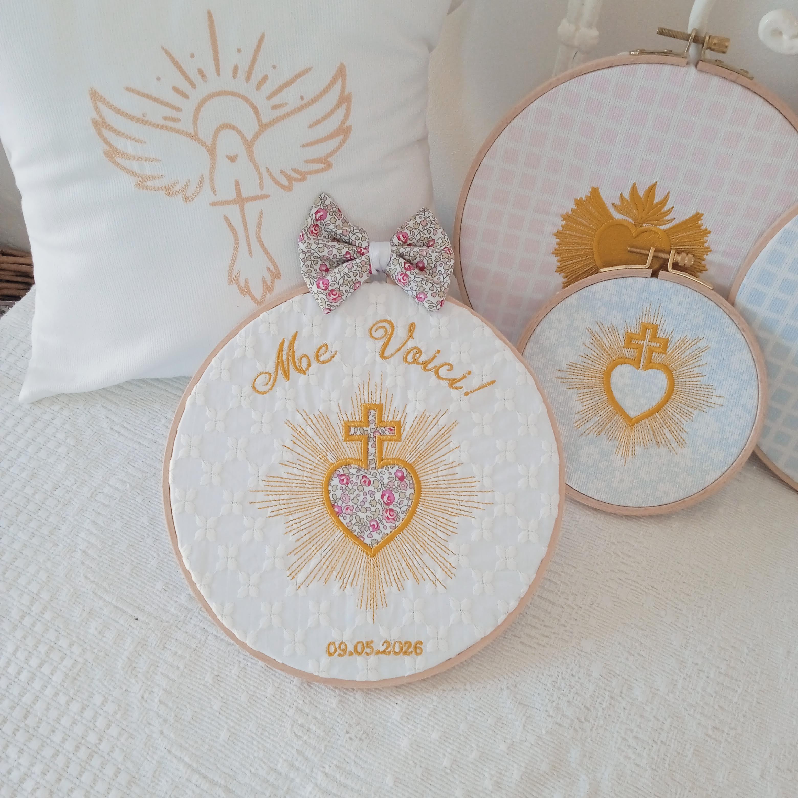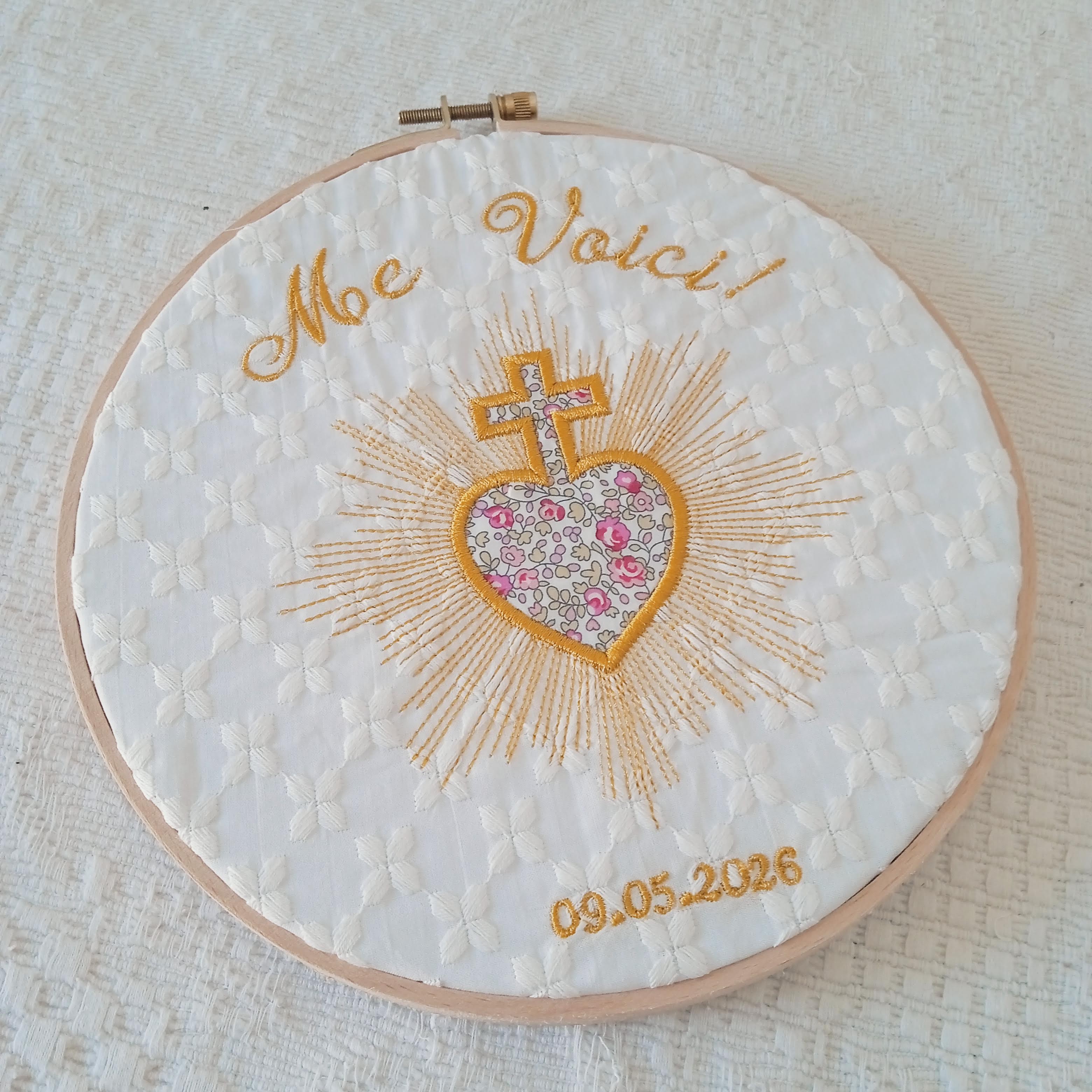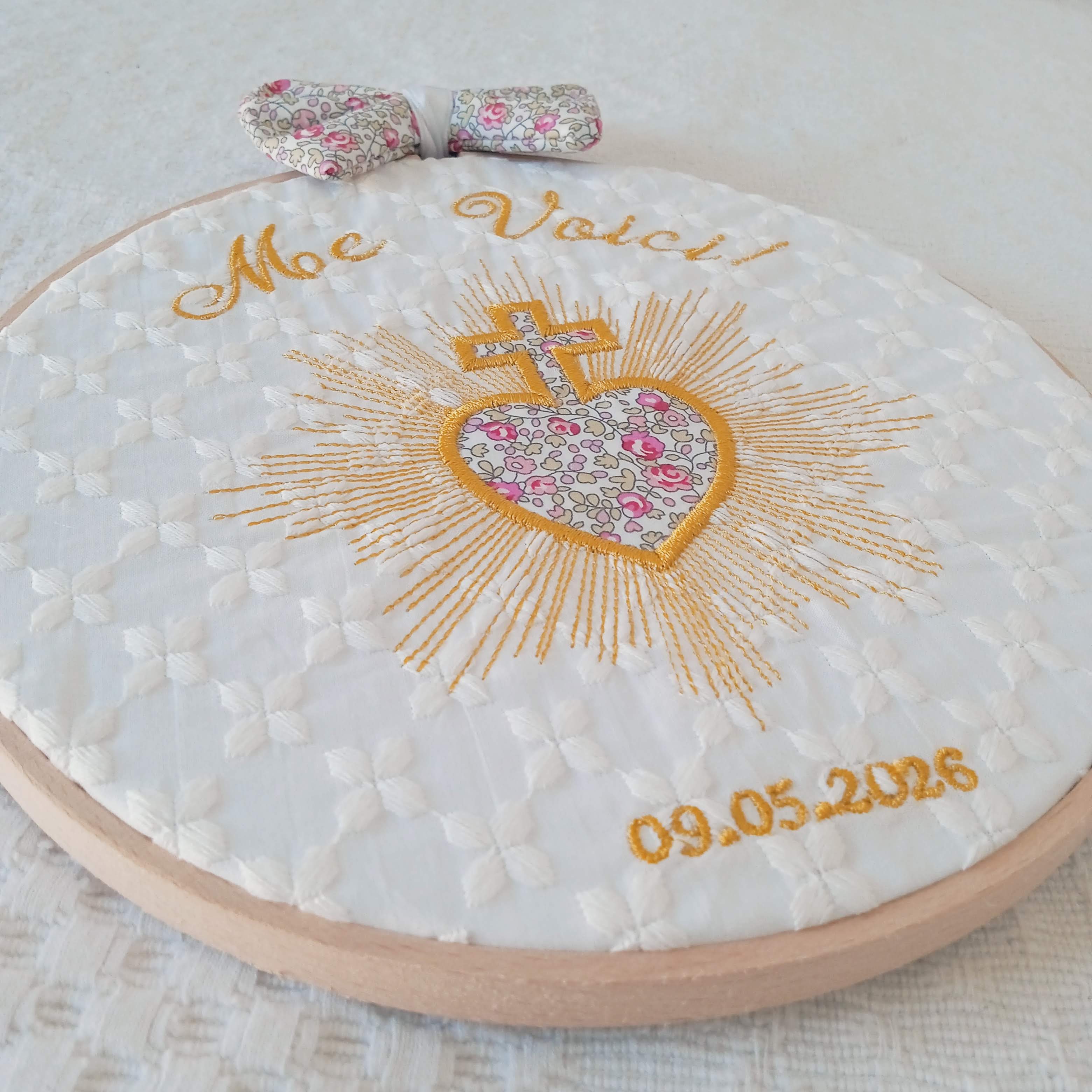 Les rayons lumineux brodés autour du cœur expriment la grâce qui rayonne et éclaire les vies. Ce symbole fort accompagne les familles chrétiennes depuis des générations comme signe de confiance et d’abandon à Dieu.