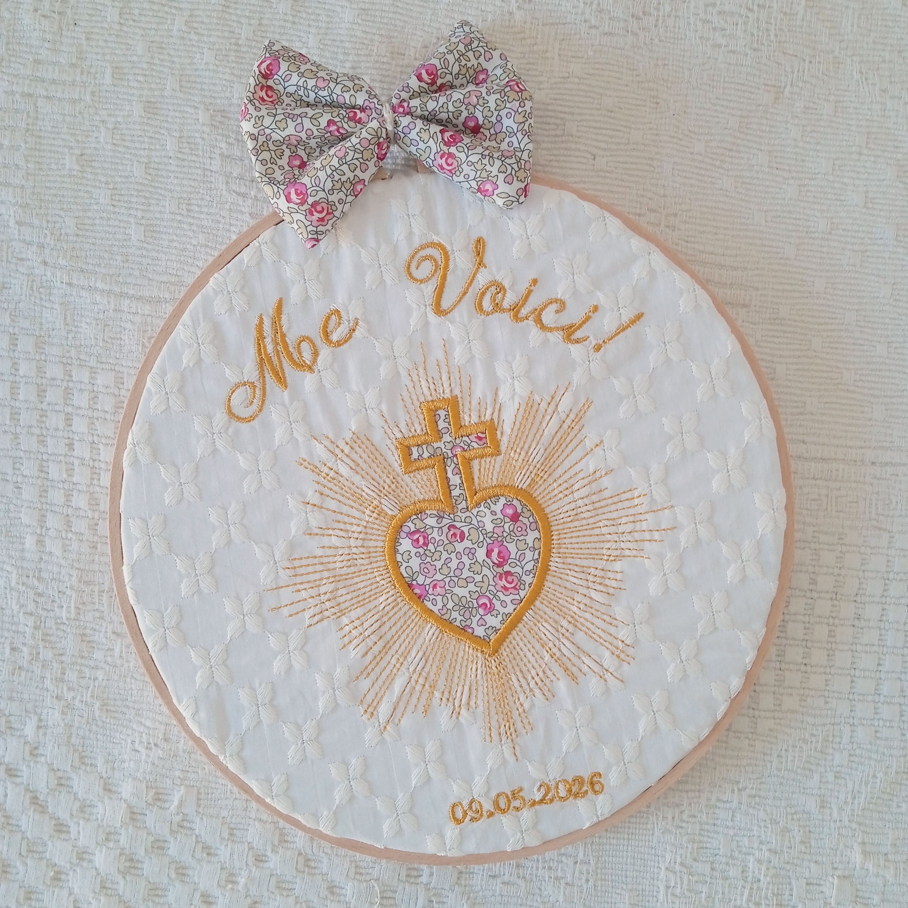 Le tambour peut être brodé avec un prénom et/ou une date (naissance, baptême, communion…), transformant cette création en souvenir unique et profondément personnel.