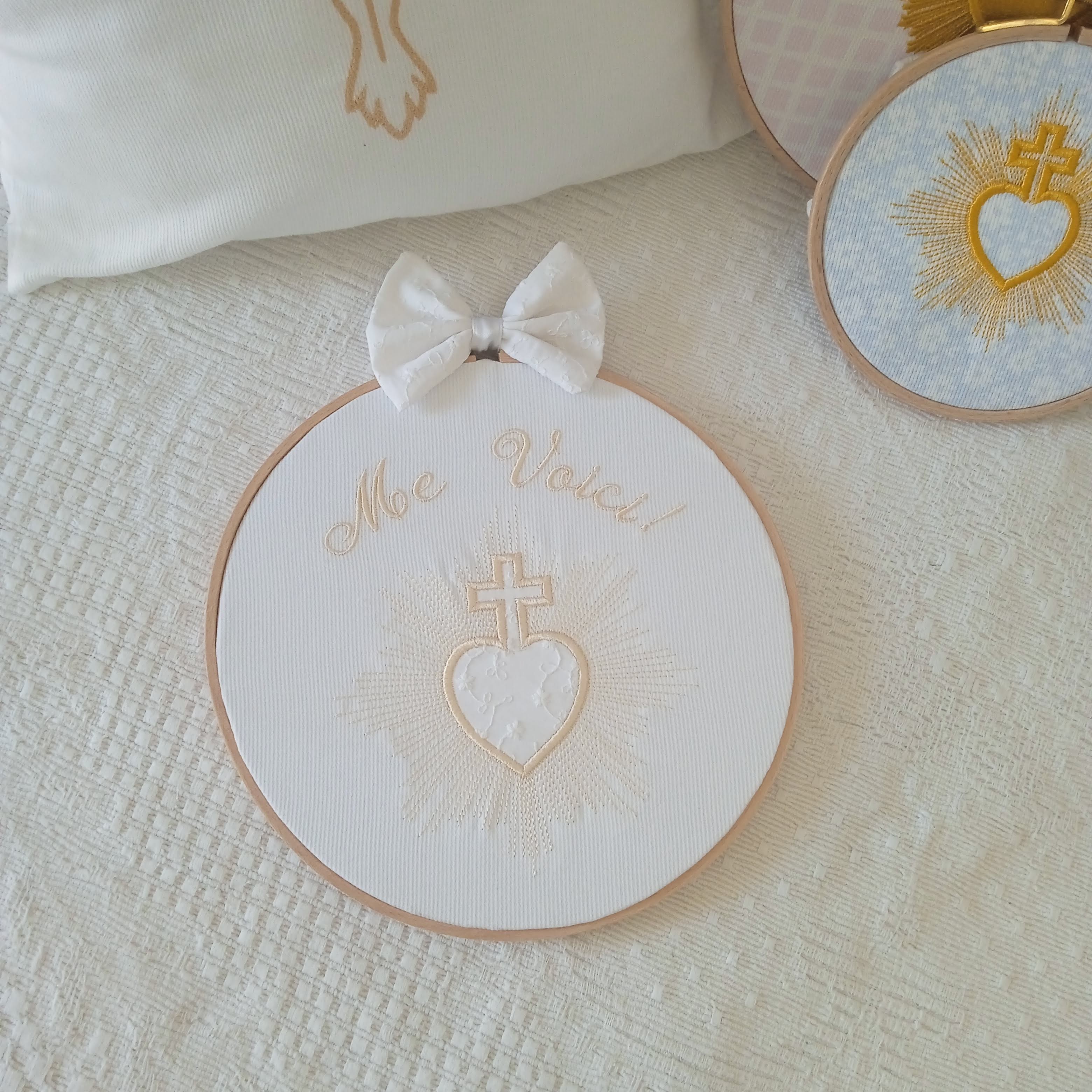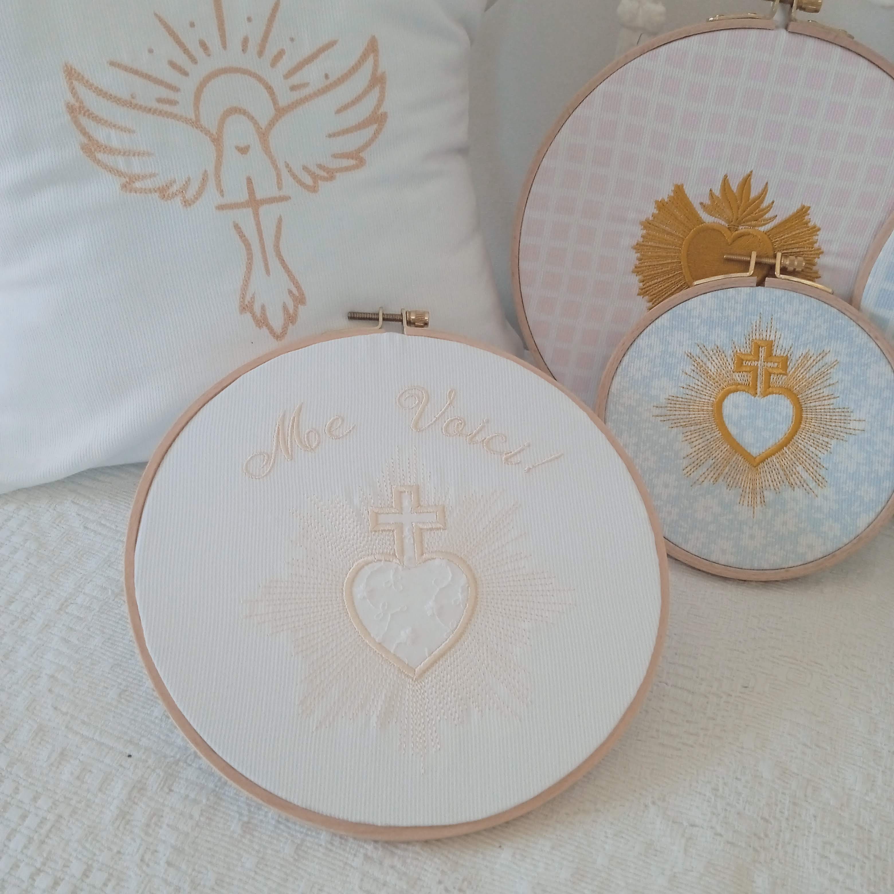 Le sacré coeur et la croix sont brodés avec un appliqué de tissu, ici un coton finement braodé façon broderie anglaise.