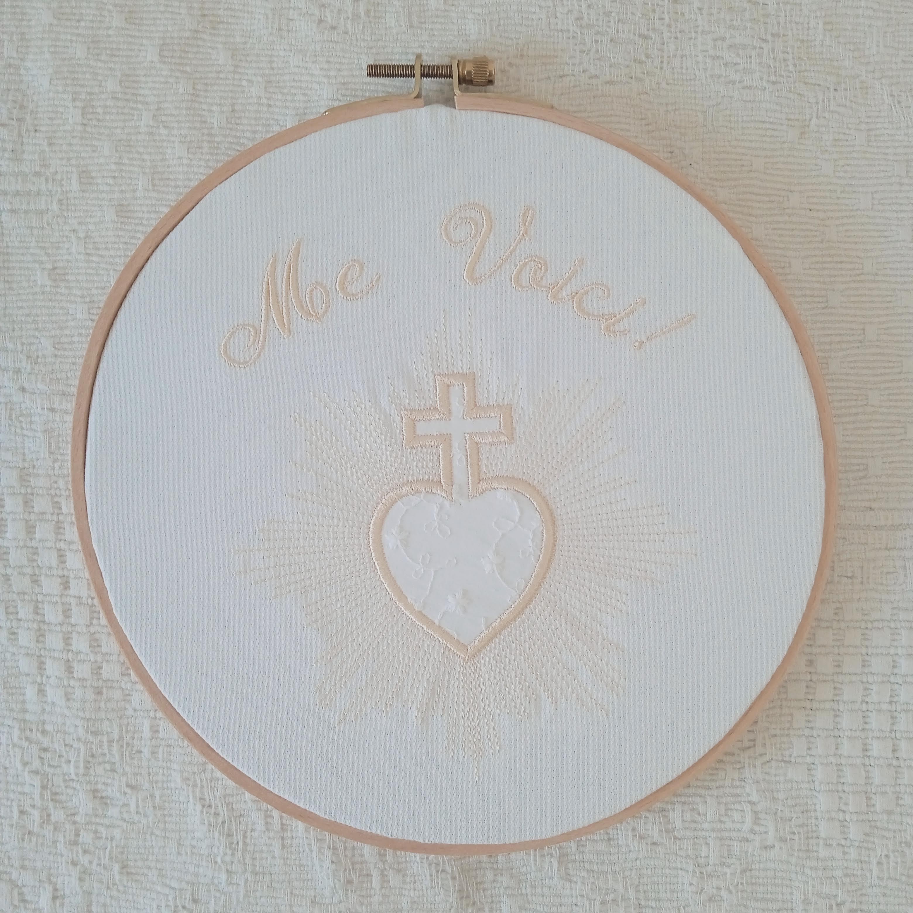 Le sacré coeur et la croix sont brodés avec un appliqué de tissu, ici un coton finement brodé façon broderie anglaise.