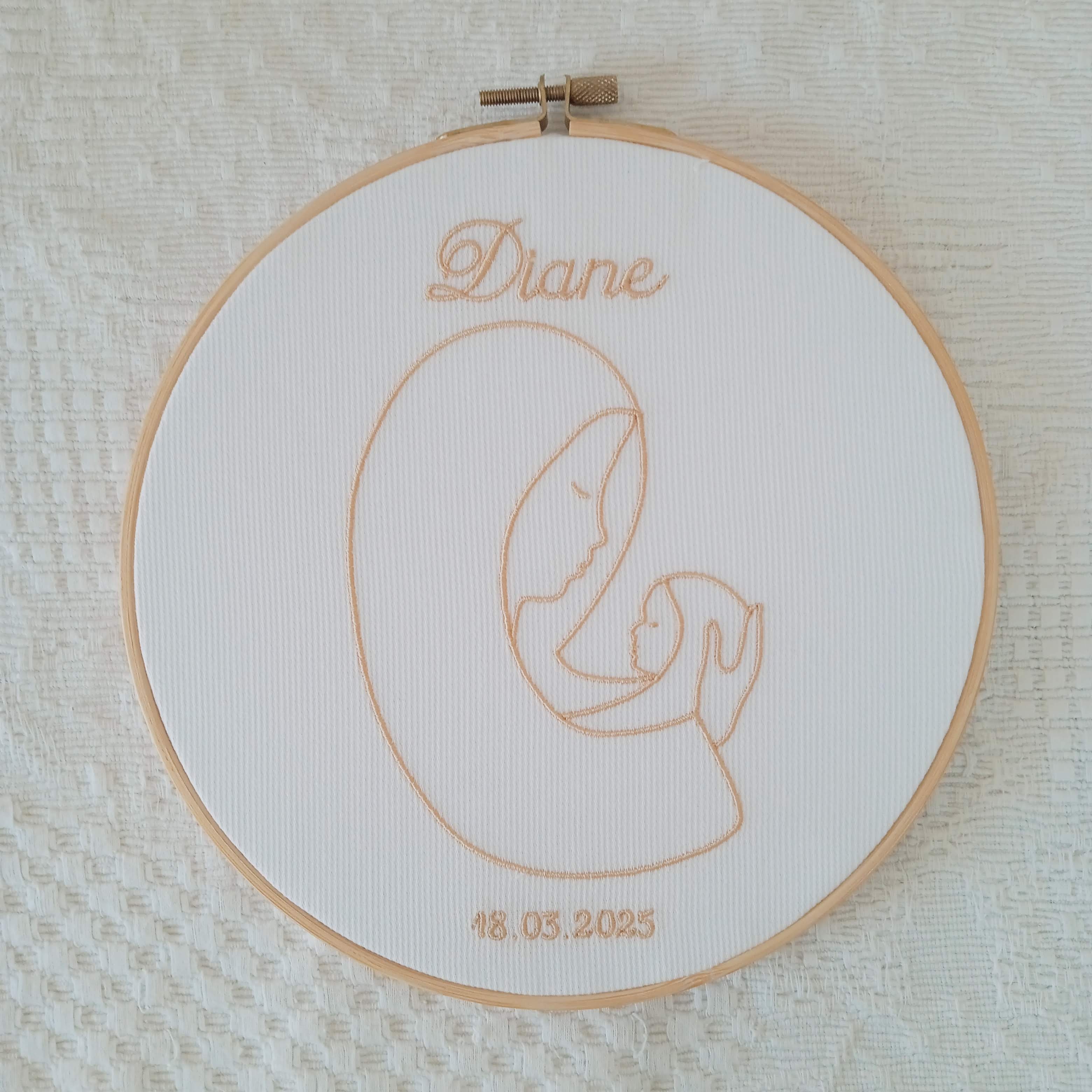 Prénom accompagné d’un dessin brodé : étoile, cœur, animal ou autre motif pour une création encore plus tendre.