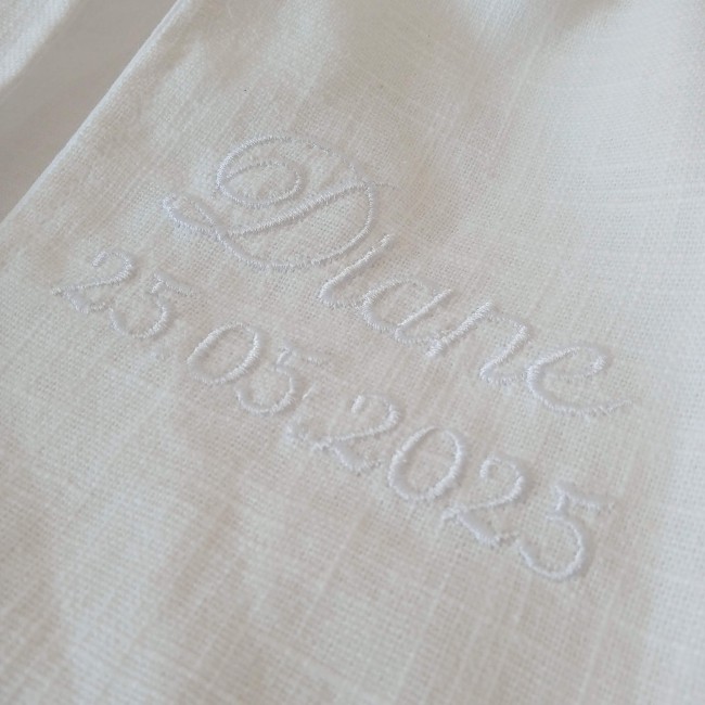 Chaque prénom raconte une histoire. Je prends soin de la mettre en valeur à travers une broderie soignée et harmonieuse.