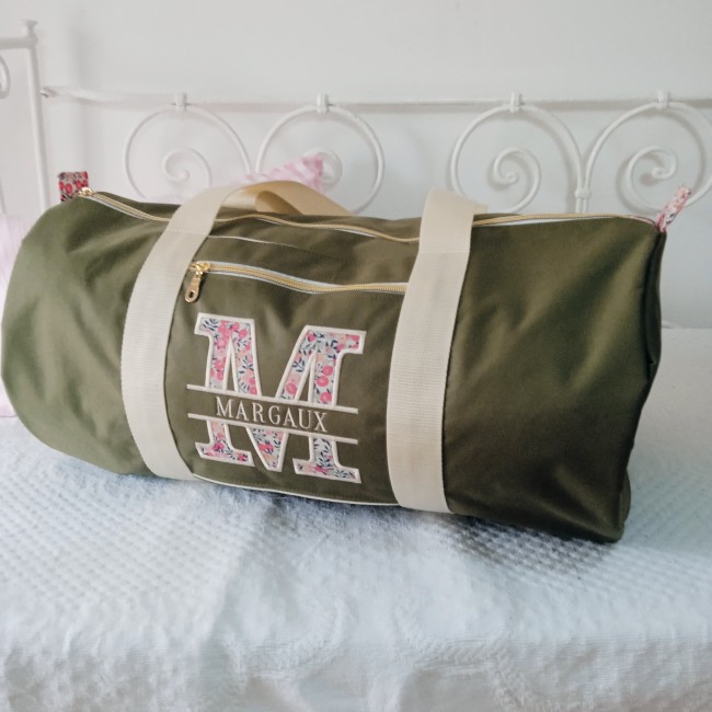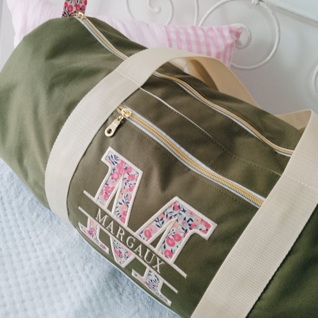 Prénom avec majuscule en appliqué de tissu : la première lettre est réalisée dans le tissu de votre choix pour un effet couture tout en douceur.