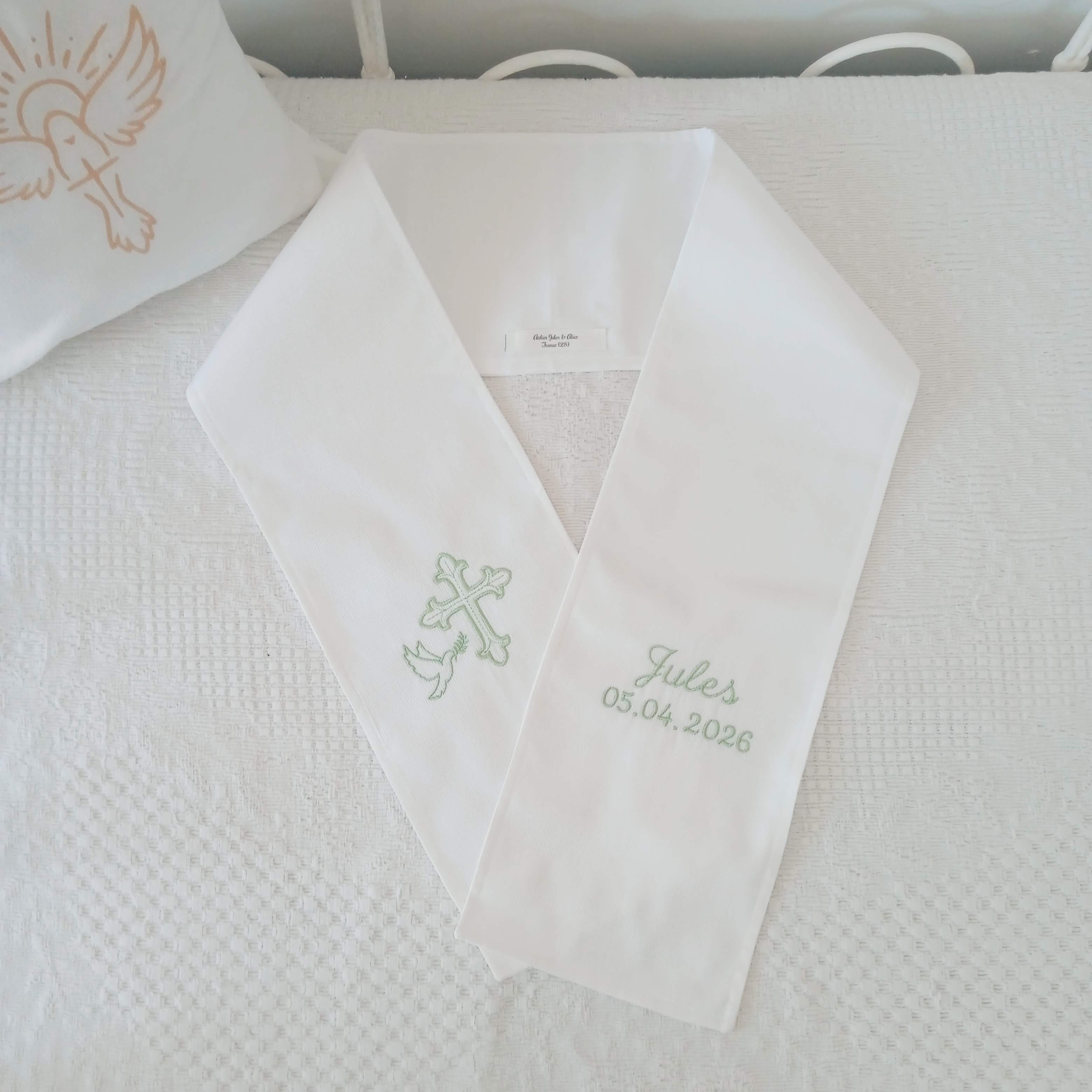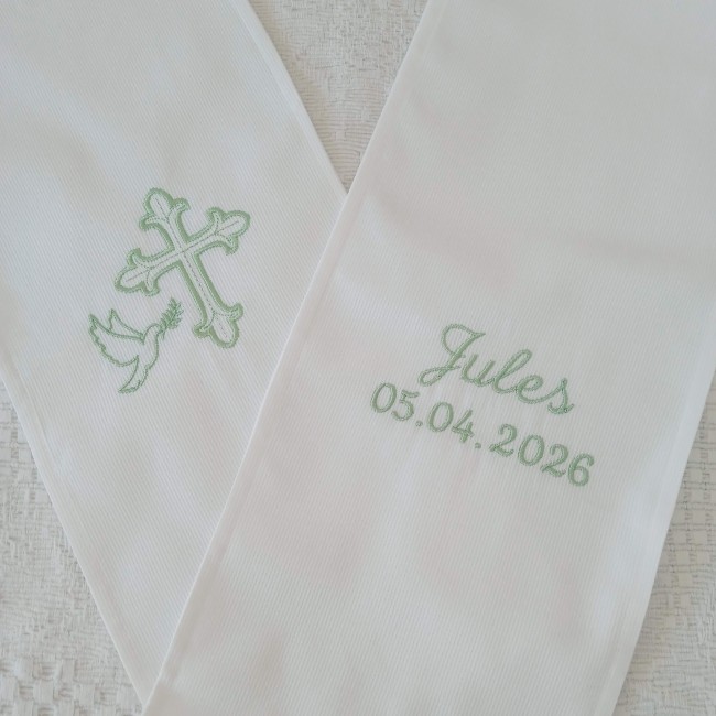 Chaque prénom raconte une histoire. Je prends soin de la mettre en valeur à travers une broderie soignée et harmonieuse.