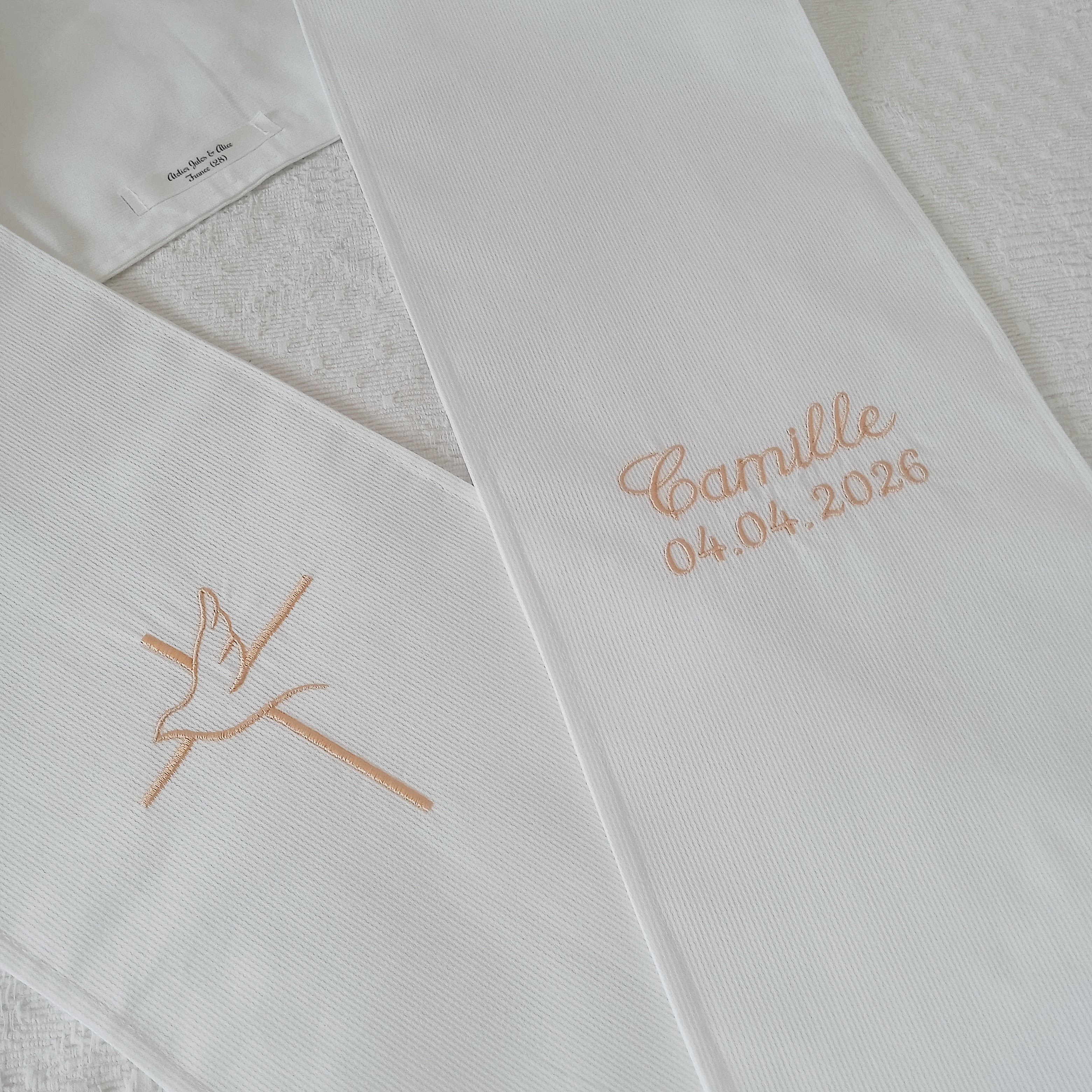 Chaque pièce est confectionnée par mes soins, dans mon atelier, spécialement pour vous, afin de transformer un simple article en souvenir précieux et personnalisé.