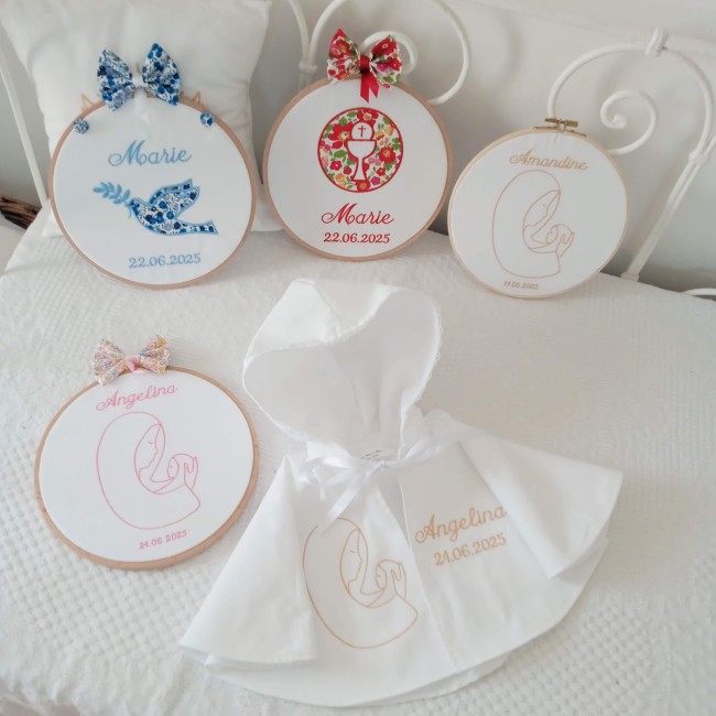 Je crée pour vous des articles personnalisés avec broderie du prénom, entièrement réalisés à la demande, pour offrir un cadeau unique et rempli de tendresse.