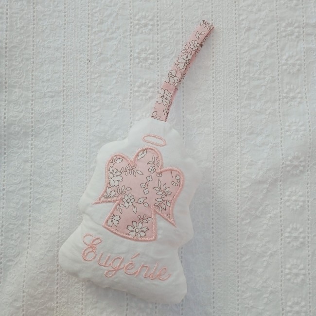 Prénom avec majuscule en appliqué de tissu : la première lettre est réalisée dans le tissu de votre choix pour un effet couture tout en douceur.