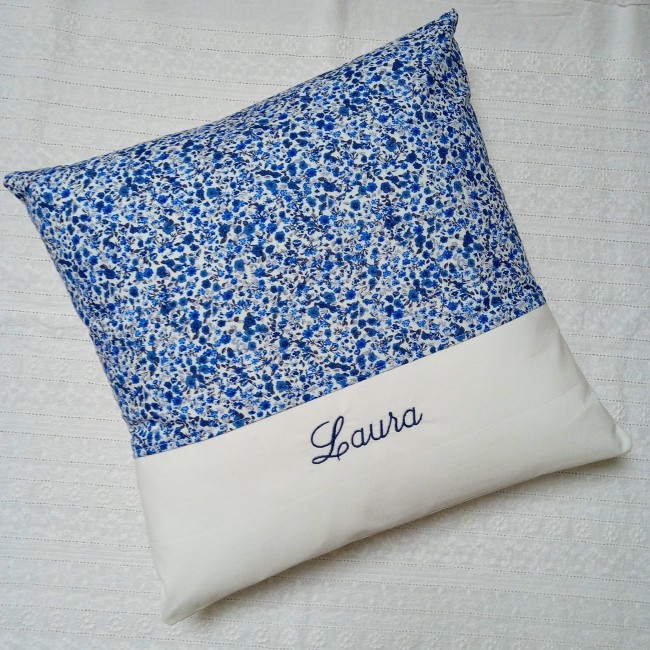 Prénom avec majuscule en appliqué de tissu : la première lettre est réalisée dans le tissu de votre choix pour un effet couture tout en douceur.