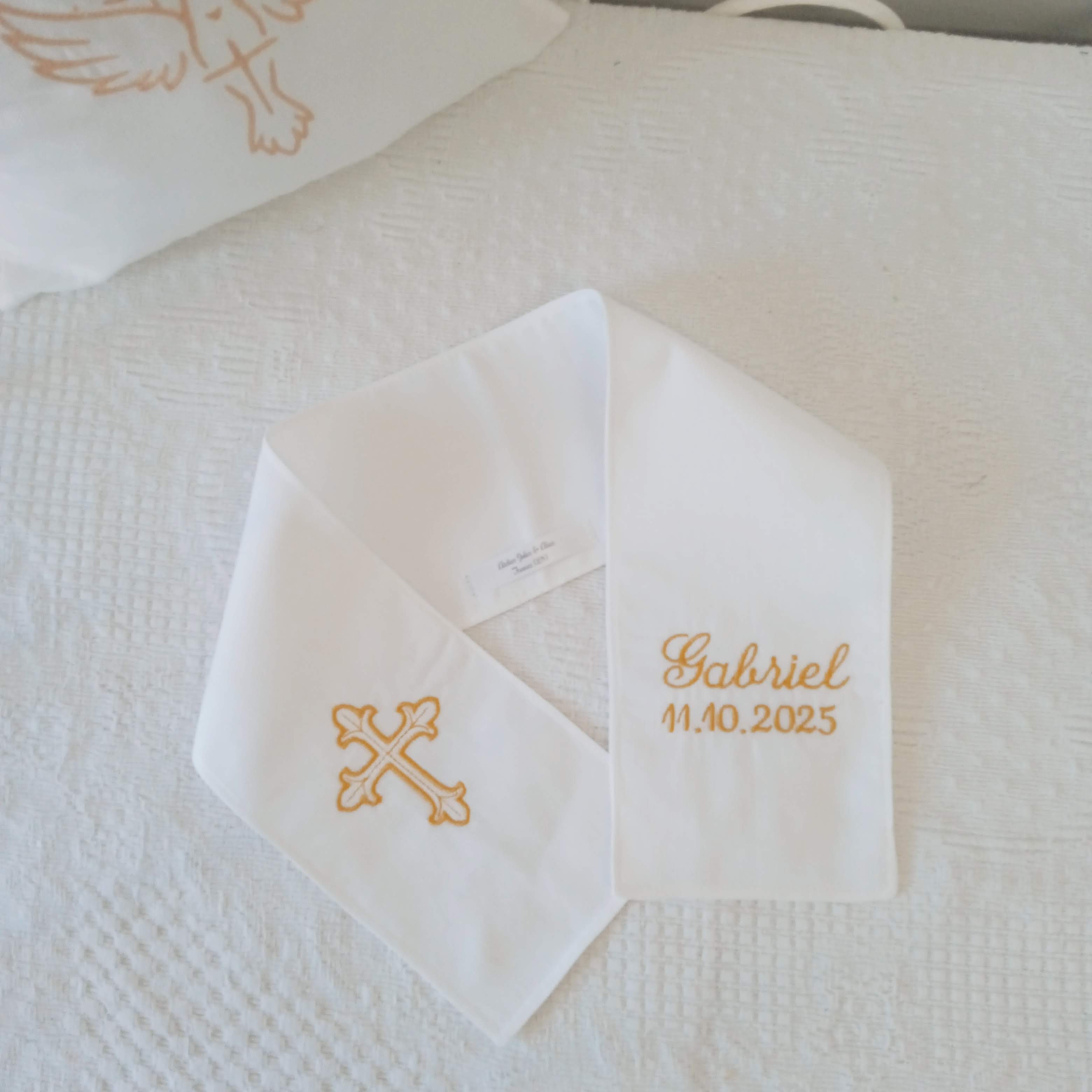 Chaque prénom raconte une histoire. Je prends soin de la mettre en valeur à travers une broderie soignée et harmonieuse.