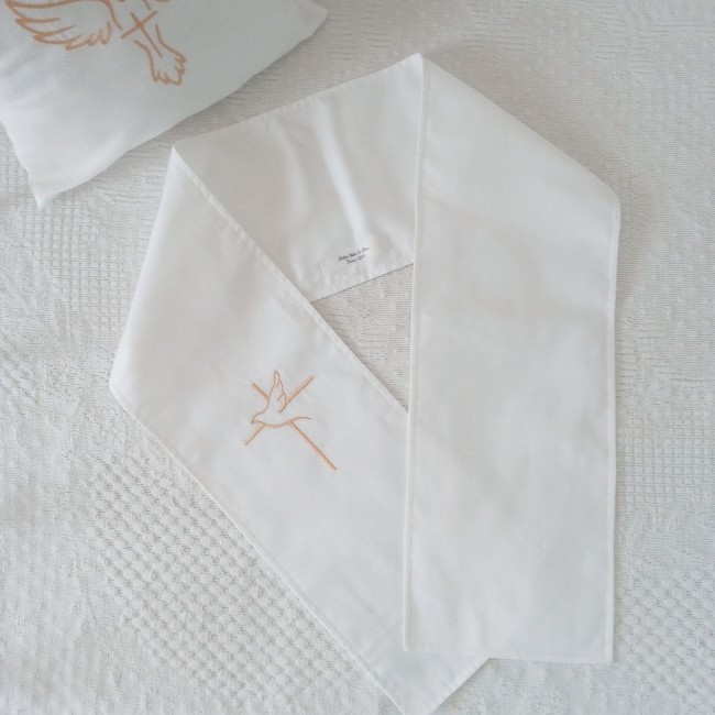 Une écharpe de baptême avec une colombe brodée est particulièrement appréciée pour les baptêmes d’adolescents et d’adultes qui souhaitent un symbole doux et spirituel.