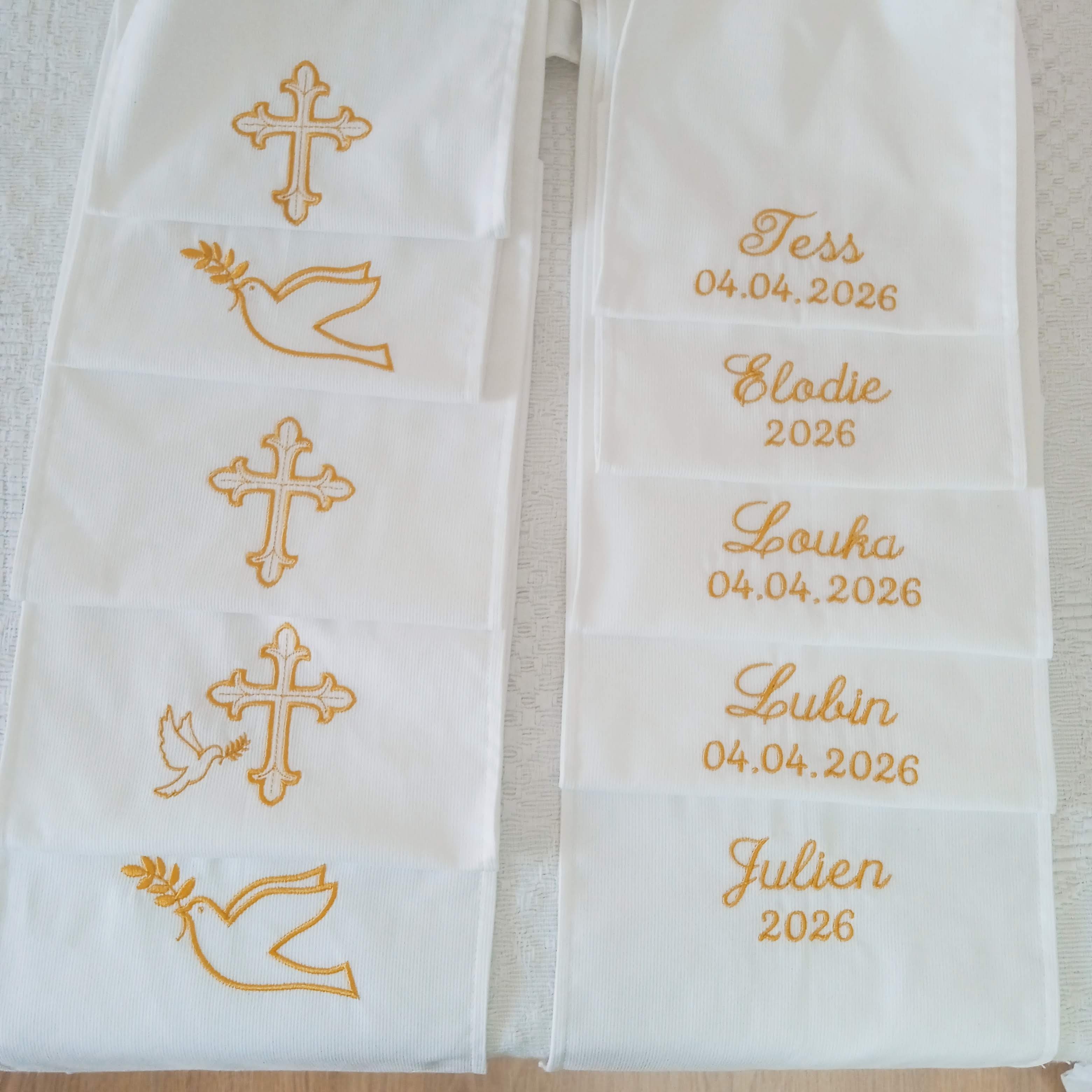 Pour marquer cette étape unique, de nombreuses paroisses proposent aujourd’hui une écharpe de baptême personnalisée. Brodée avec un symbole chrétien, un prénom et la date du baptême, elle devient un souvenir précieux de cette célébration.
