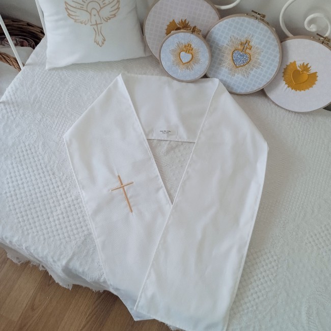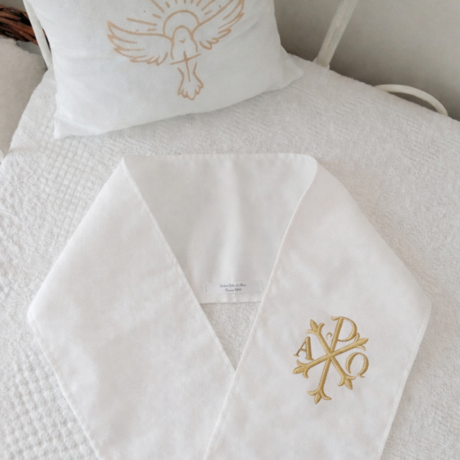 Une écharpe de baptême brodée avec un chrisme donne une dimension très traditionnelle et liturgique à la célébration.