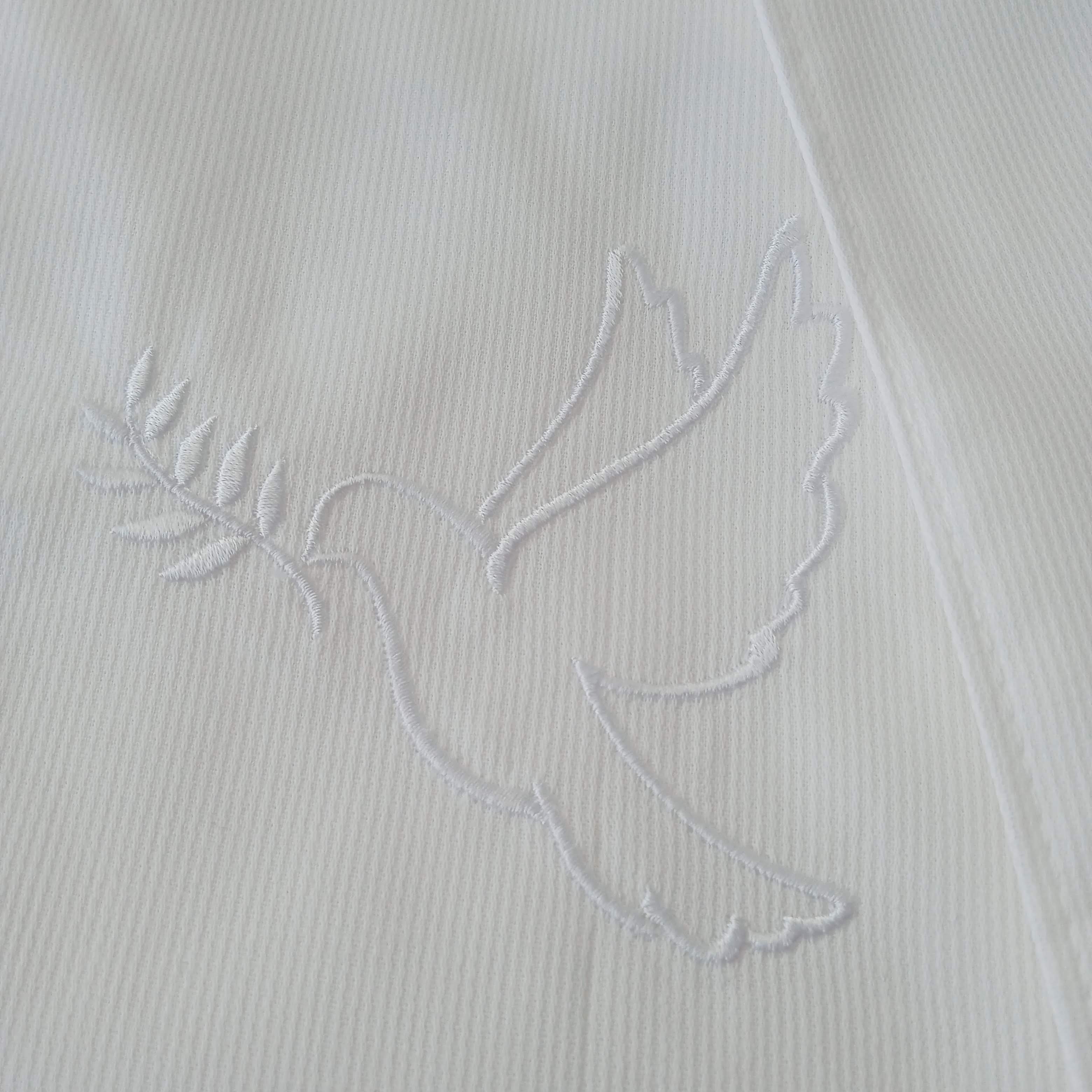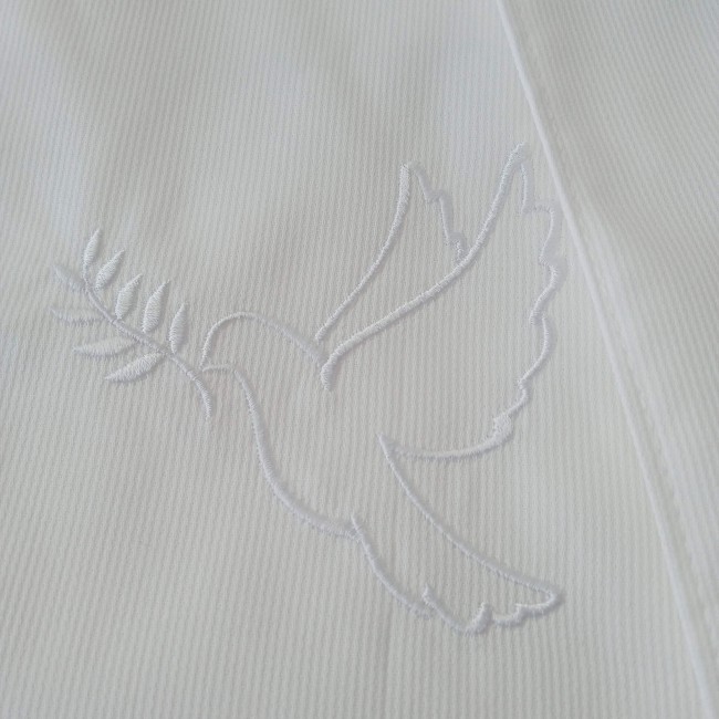 Certaines écharpes sont ornées d’une broderie délicate représentant une colombe de la paix, symbole de l’Esprit Saint, de sérénité et de bénédiction. Ce motif apporte à l’écharpe une dimension spirituelle subtile et poétique, idéale pour célébrer le baptême avec grâce et raffinement.